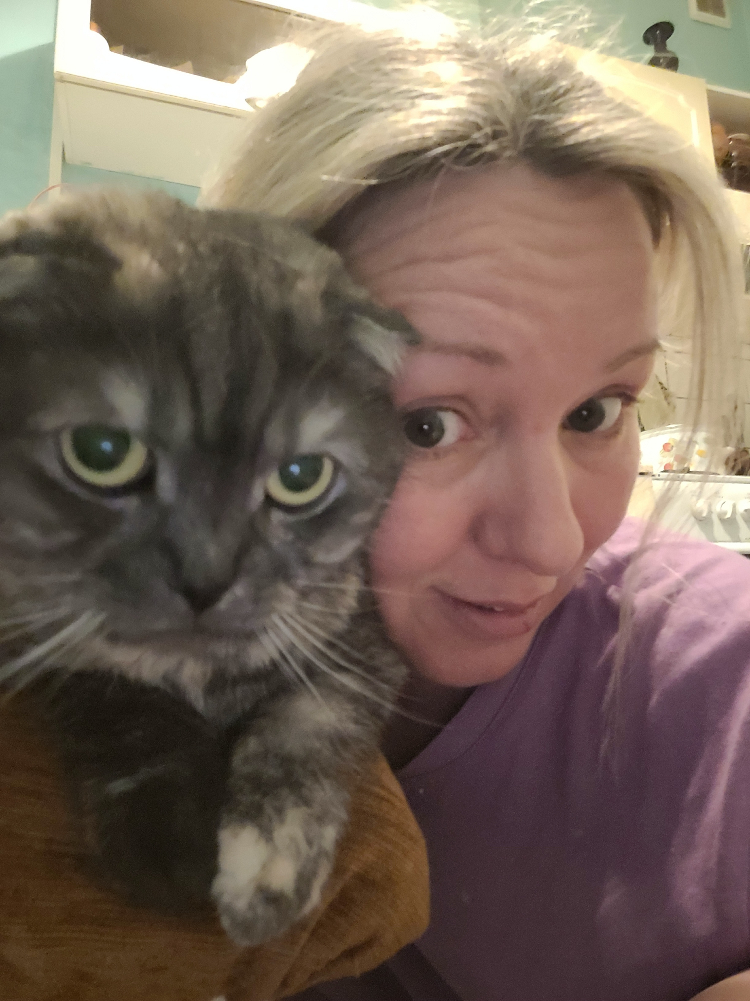 A woman with blonde hair and a purple shirt is holding a gray and white cat. The cat has large green eyes and a white spot on one of its paws. The background is blurry but shows a white cabinet and li…read more