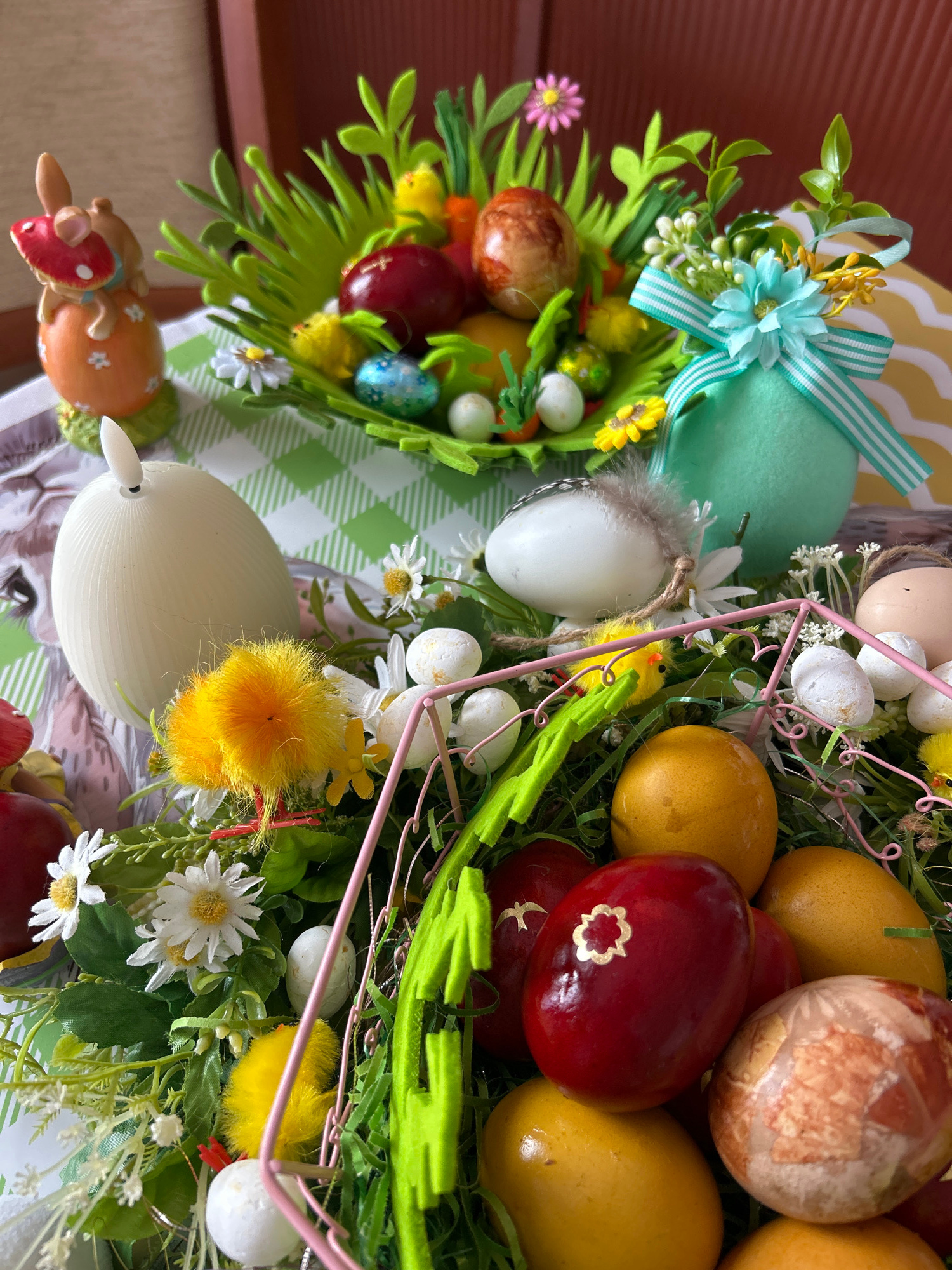The image depicts a close-up of Easter decorations, likely indoors, but the specific location in Plovdiv, Bulgaria is not discernible from the image. The decorations are arranged as wreaths or centerp…read more