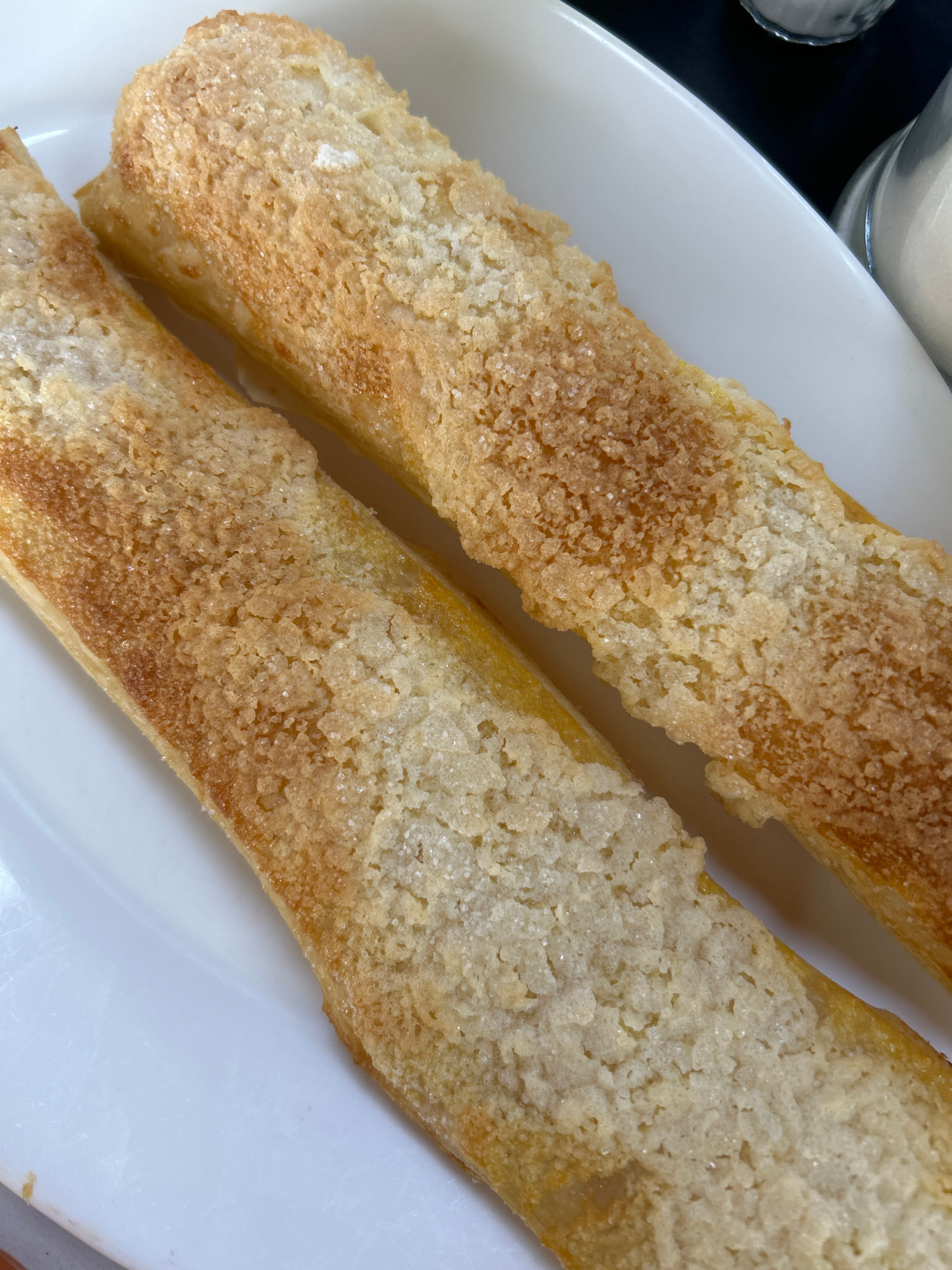 Two pastries covered in sugar sit on a white plate. The pastries are long and rectangular, appearing golden brown with a textured, sugary surface. The background is blurred, revealing a glass containe…read more