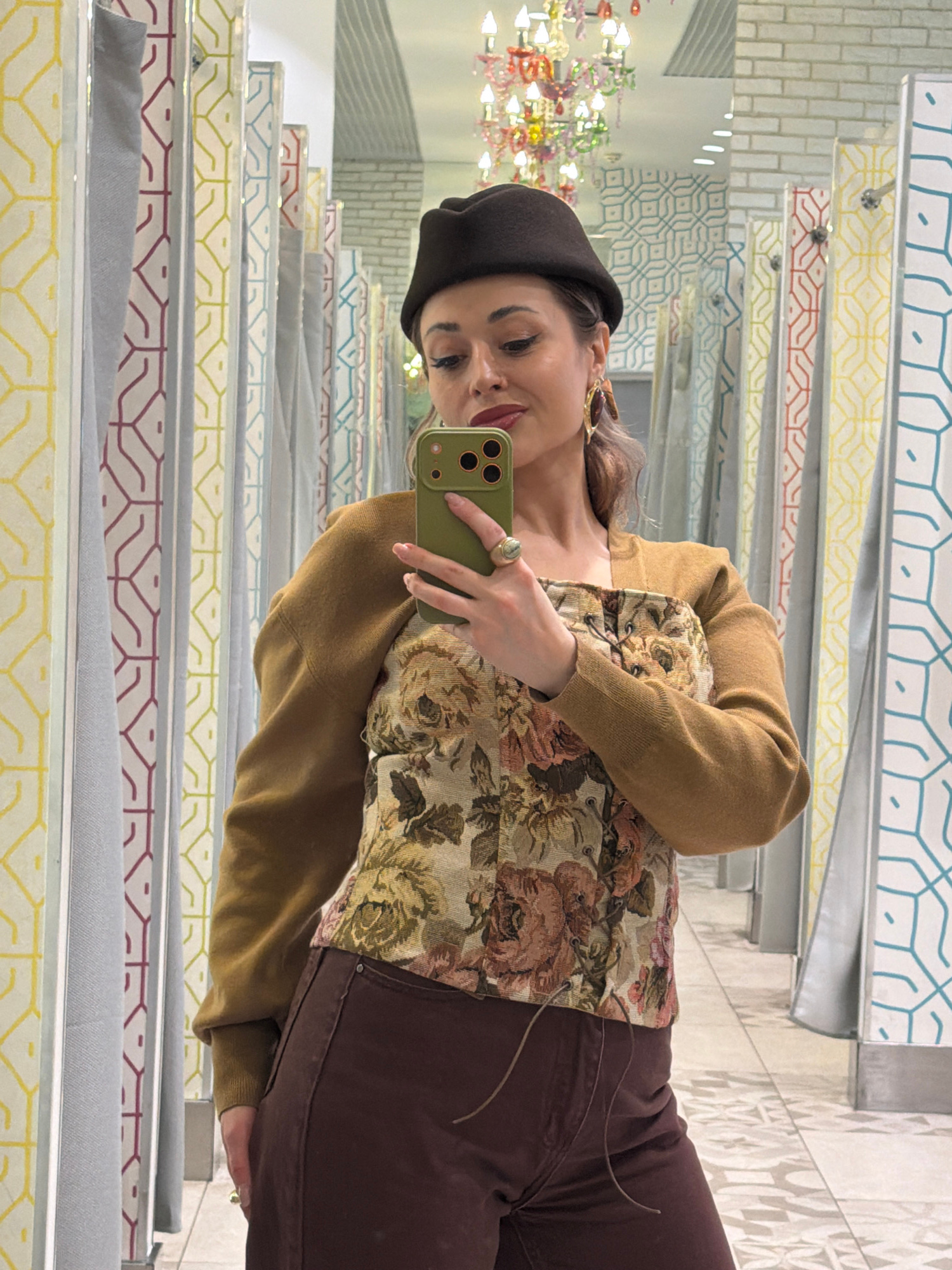 A woman is taking a selfie in front of a mirror. She is wearing a beret, floral top with a mustard-colored cardigan, and brown pants. She is holding a green smartphone in her left hand and has a ring…read more