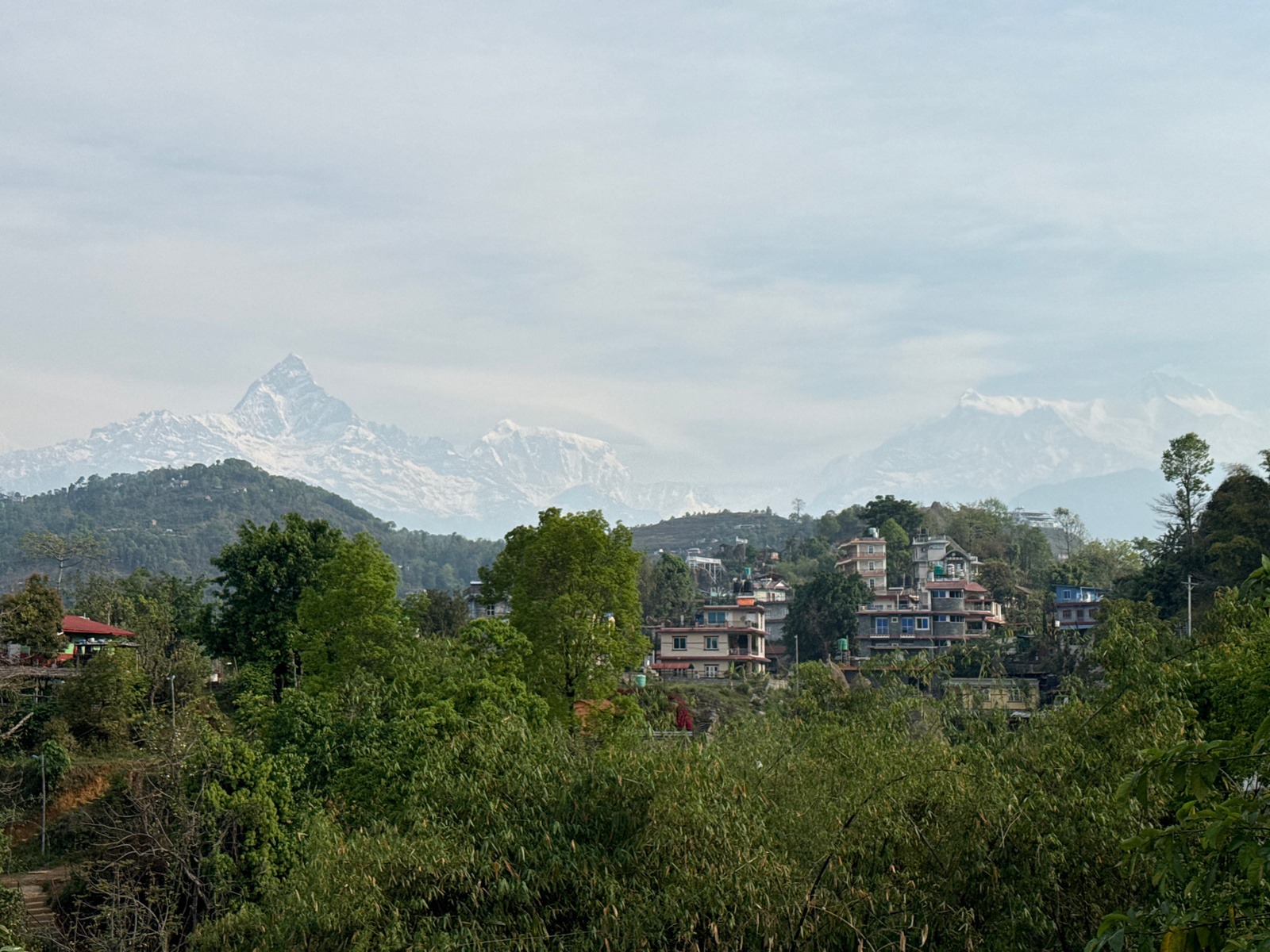The image depicts a landscape in Pokhara, Nepal. In the foreground, lush green foliage fills the lower half of the frame, predominantly consisting of trees and bamboo-like plants. Above the vegetation…read more