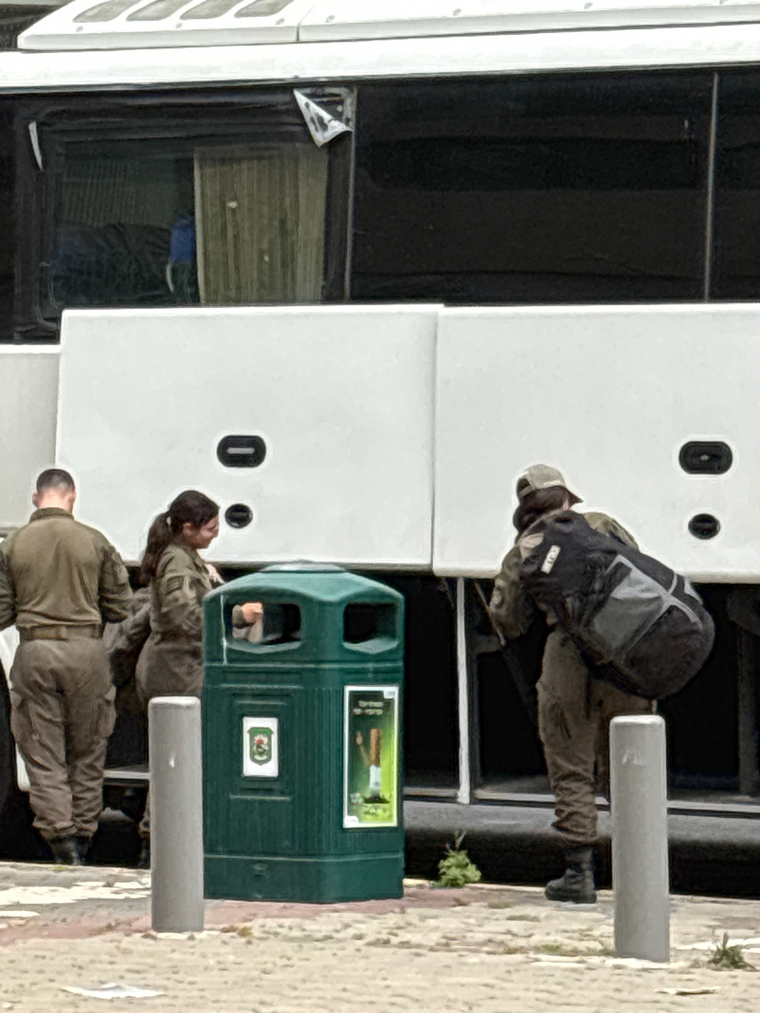 This image, taken in Ramat Gan, Israel, captures an outdoor scene featuring four individuals, a white bus, and a dark green public waste bin. The photograph appears to be oriented vertically, suggesti…read more