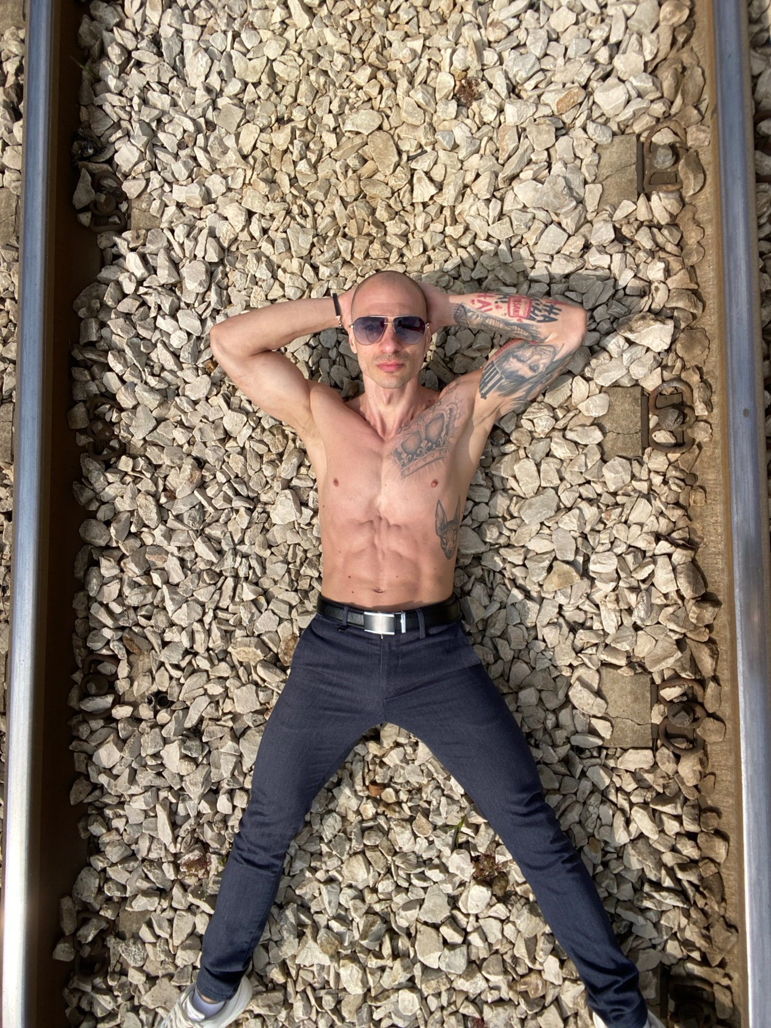 A shirtless man is lying on his back on a railroad track composed of gravel and metal rails. He is wearing jeans, a belt, sunglasses, and a bracelet on his left wrist. The man has a shaved head and nu…read more