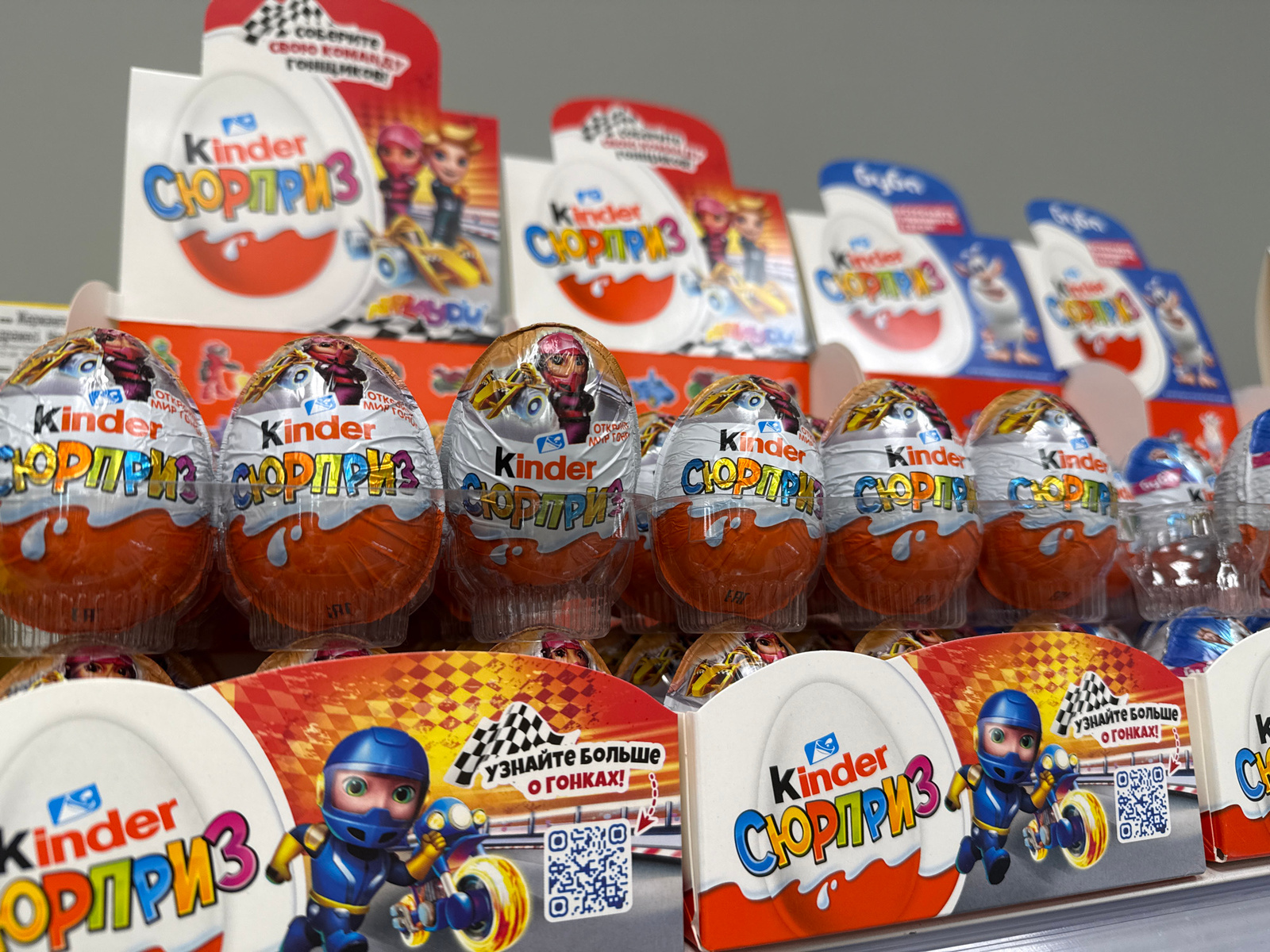 The image shows a shelf stocked with Kinder Surprise eggs, particularly the "СЮРПРИЗ" variety, indicating a Russian market presence. The eggs are prominently displayed, with special edition packaging…read more