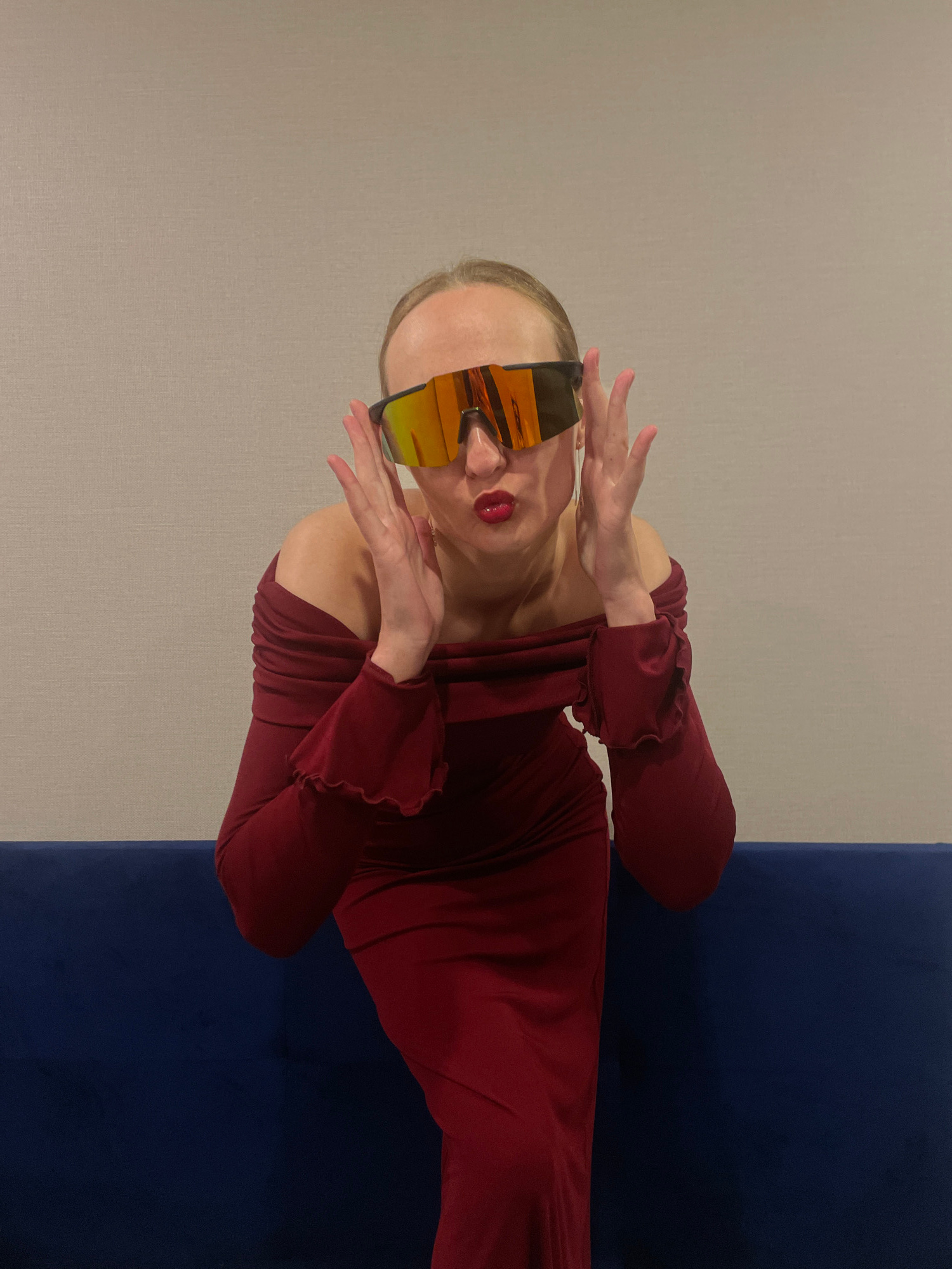 A woman wearing a maroon dress and futuristic gold visor sunglasses is positioned against a background consisting of a light grey wall on the left and a dark blue surface on the right. She is posing w…read more