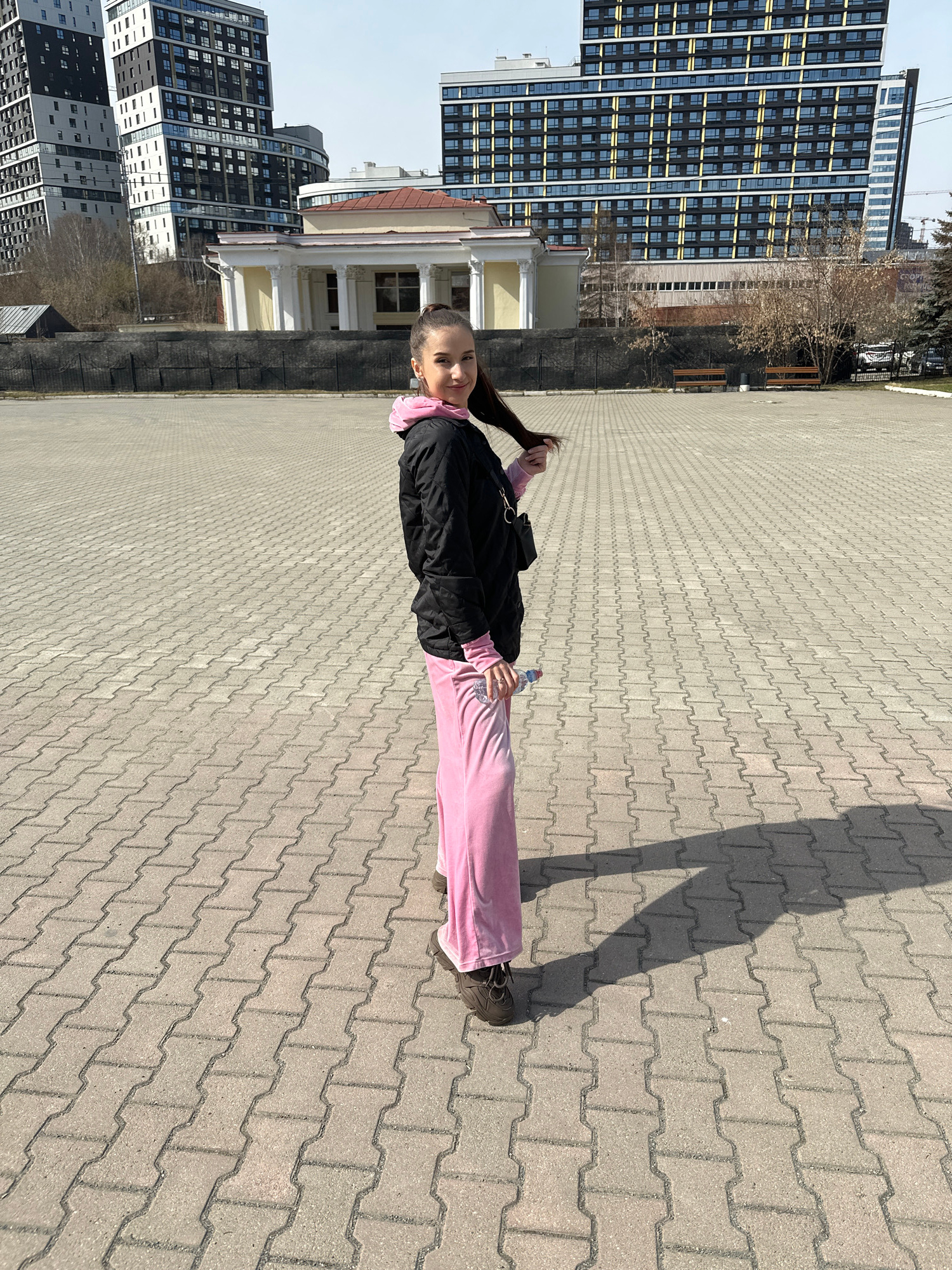 A woman stands in a large paved area in Yekaterinburg, Russia. She wears a black jacket, pink pants, and dark shoes, holding a water bottle in her right hand and touching her hair with her left. A lonβ¦read more
