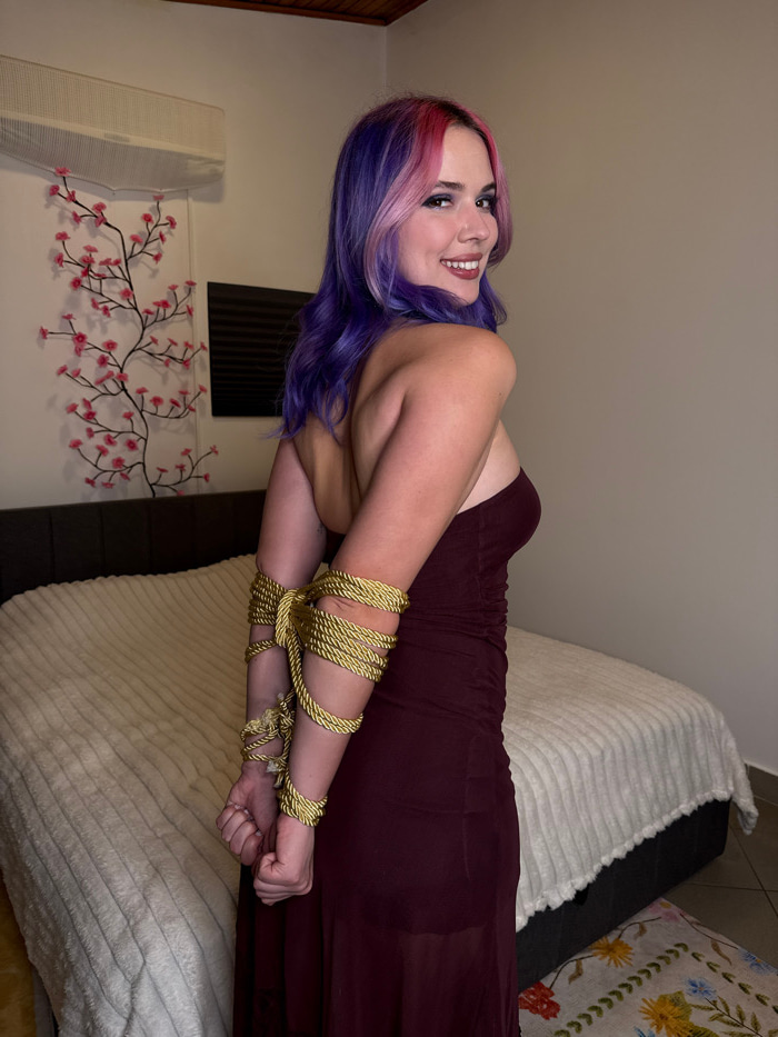 A female individual with purple and pink highlighted hair is depicted standing indoors, turning her head to smile over her right shoulder directly at the viewer. She is wearing a strapless, floor-leng…read more