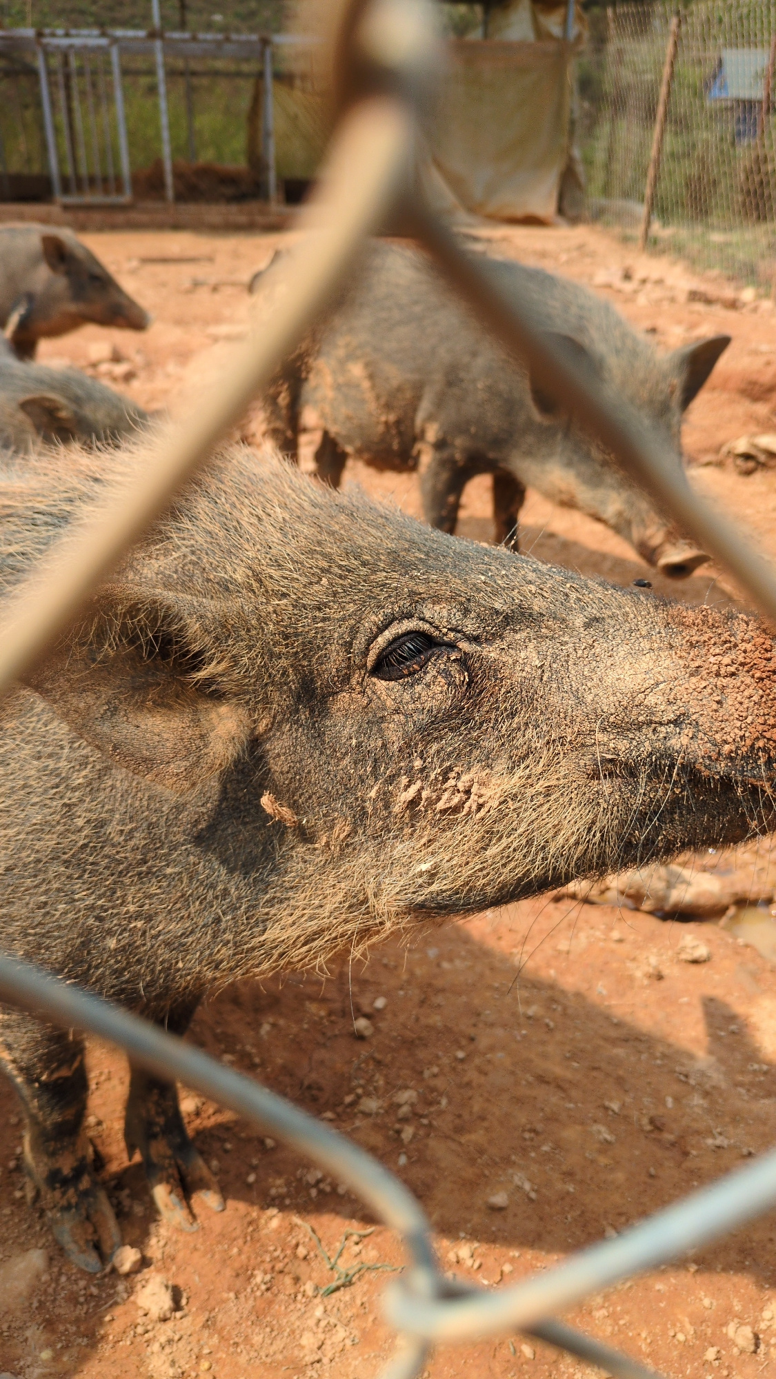 Captured through a wire fence, the image focuses on a group of wild boars in an enclosure at an unspecified location in Lạc Dương, Vietnam. The foreground features a boar's head in close-up, revealing…read more