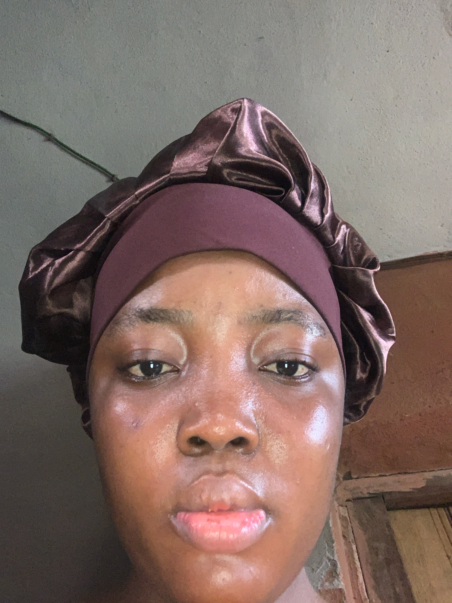 A close-up photograph shows a dark-skinned individual wearing a satin bonnet, with a mauve colored headband, lying down. The background appears to be a wall and a partially visible window. The locatio…read more