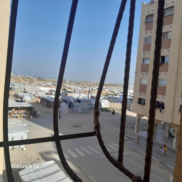 View from a high vantage point, possibly a window behind a decorative iron grill. A street with pedestrian crossings runs below, alongside a dense encampment of tents and makeshift dwellings stretchin…read more