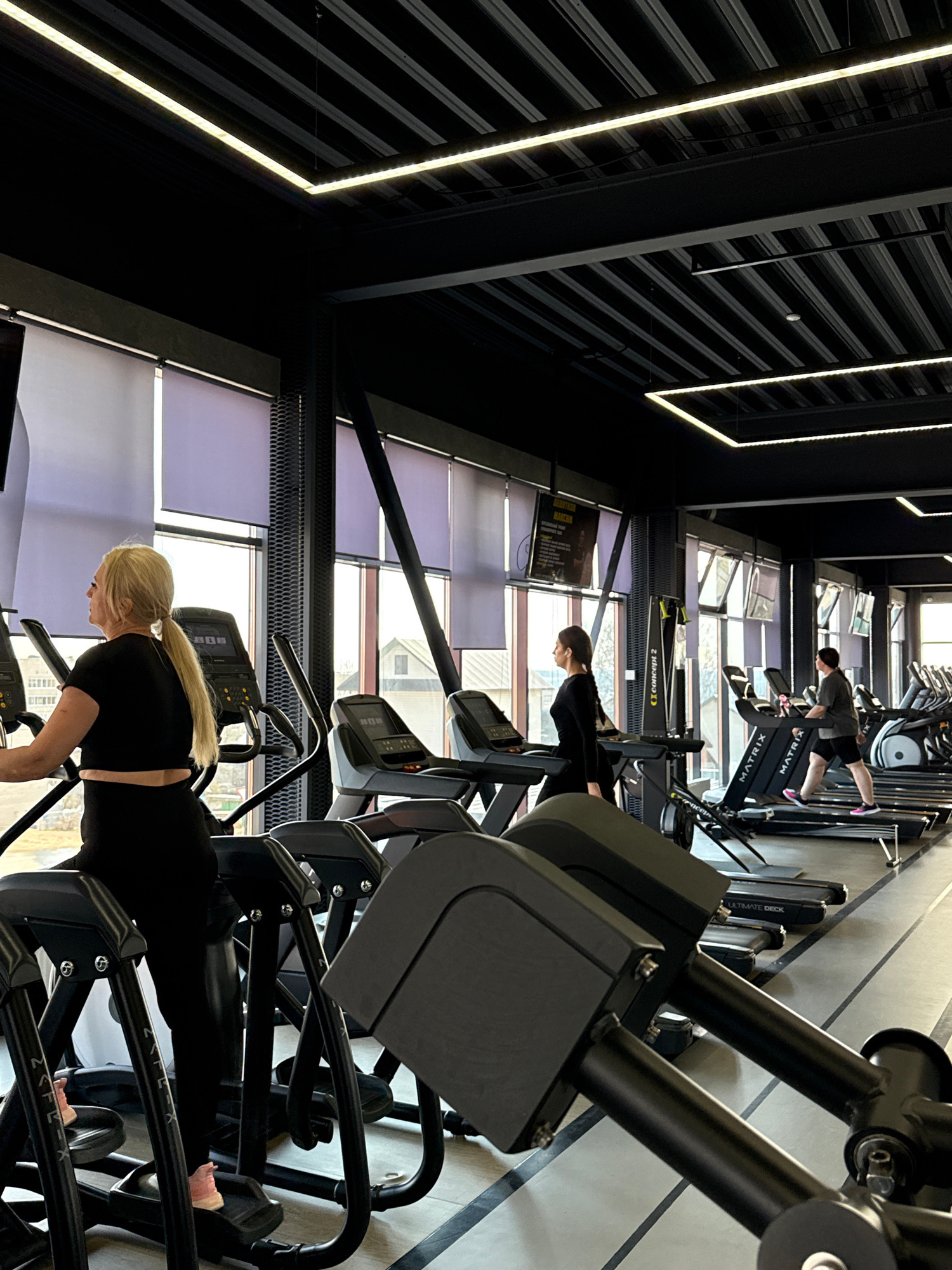The image displays a modern gym interior where three individuals are engaged in cardiovascular exercise. In the immediate foreground, a woman with blonde hair tied in a ponytail, wearing a black t-shi…read more