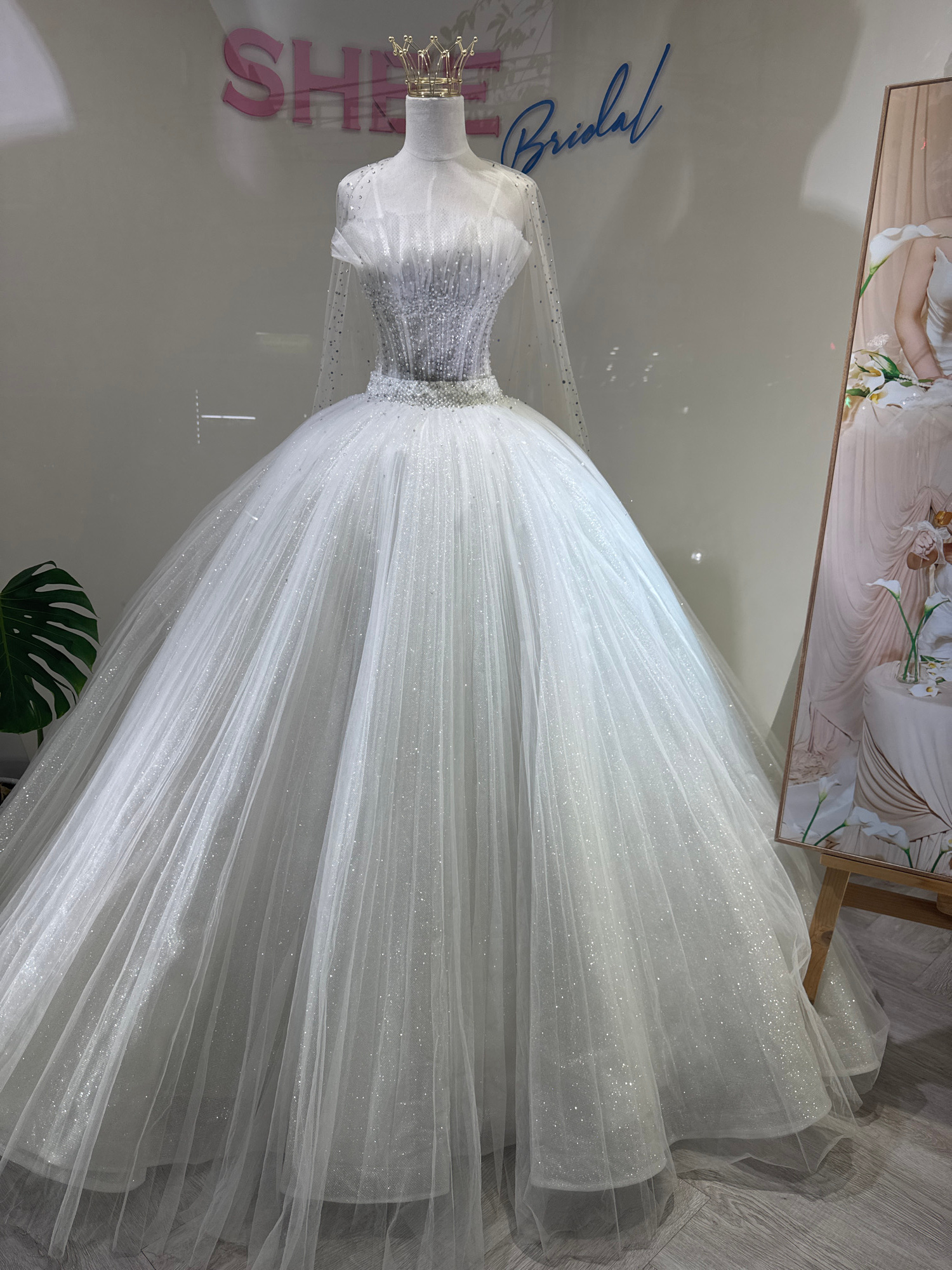 The image shows a white wedding dress displayed on a mannequin in what appears to be a bridal shop. A gold crown is placed atop the mannequin's head. The dress features a beaded or sequined bodice and…read more