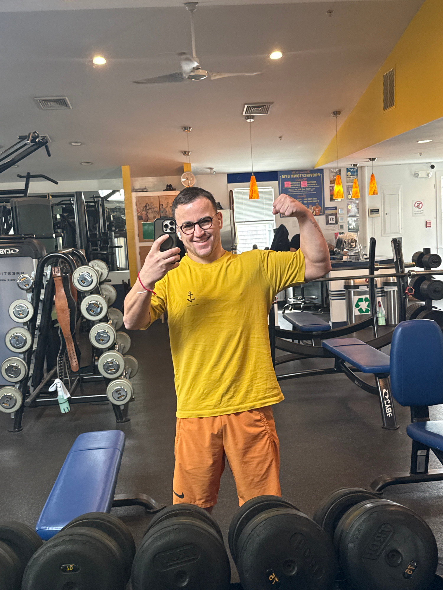 A man in his 40s with short dark hair and glasses is posing for a selfie in a gym. He is wearing a yellow t-shirt with an anchor on it and orange shorts. He is holding his phone in his left hand and f…read more