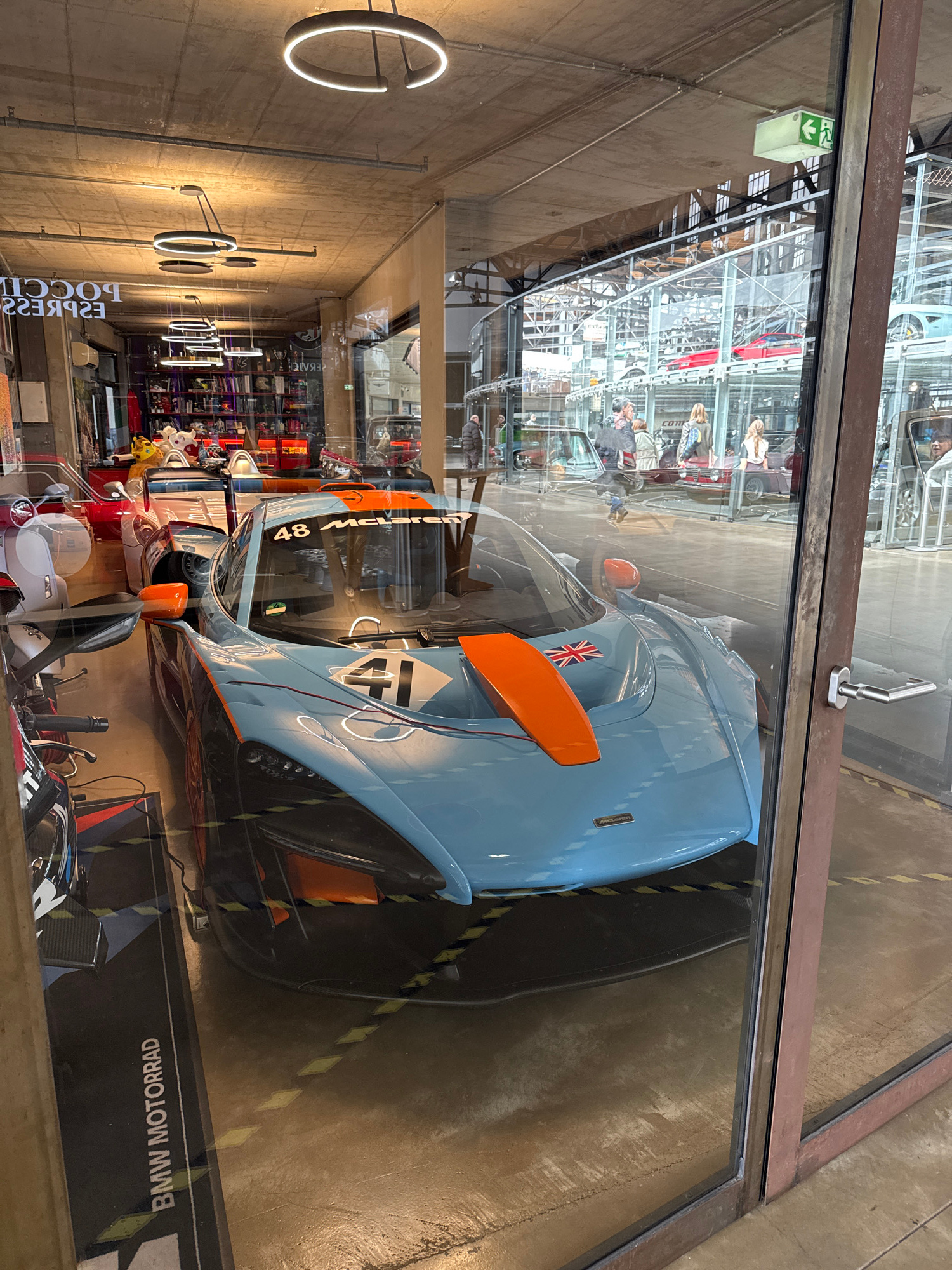 The image shows a light blue McLaren race car with orange accents and the number 41, behind a glass window. The car is in a showroom or museum, visible through the reflection in the glass. The window…read more