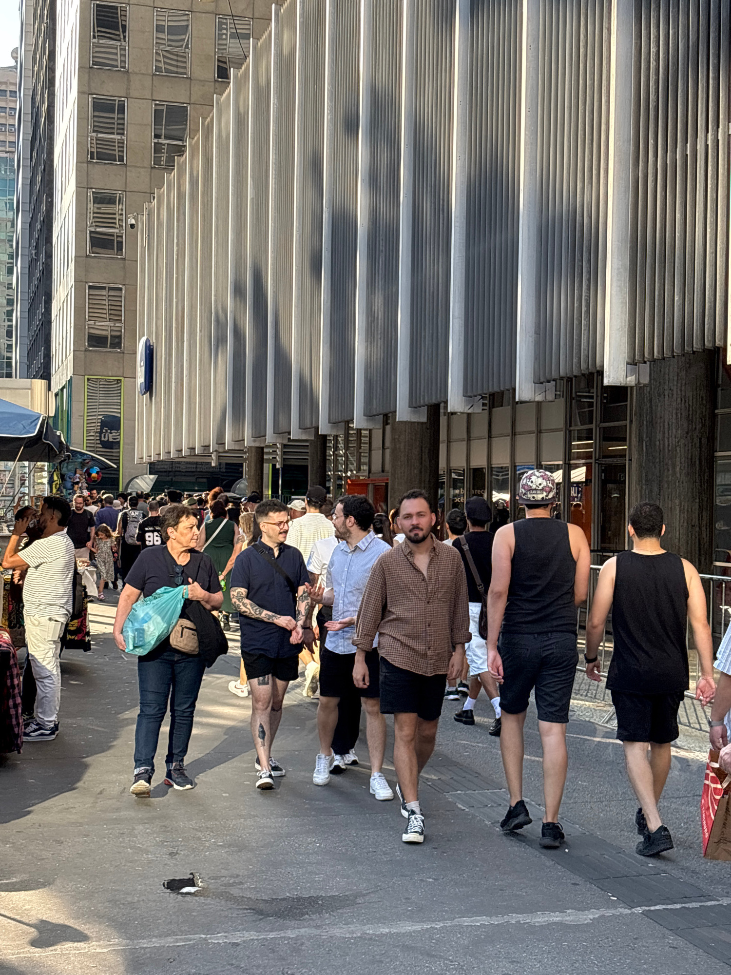 The image shows a crowd of people walking along a street in São Paulo, Brazil. The majority of people are dressed casually, with a variety of skin tones and ages represented. A few individuals are closer to the camera and are walking away from the viewer. A building with a corrugated metal facade is visible on the left side of the frame. Other buildings and structures are visible in the background, as well as vendor booths. The street appears to be paved. | Open Wire