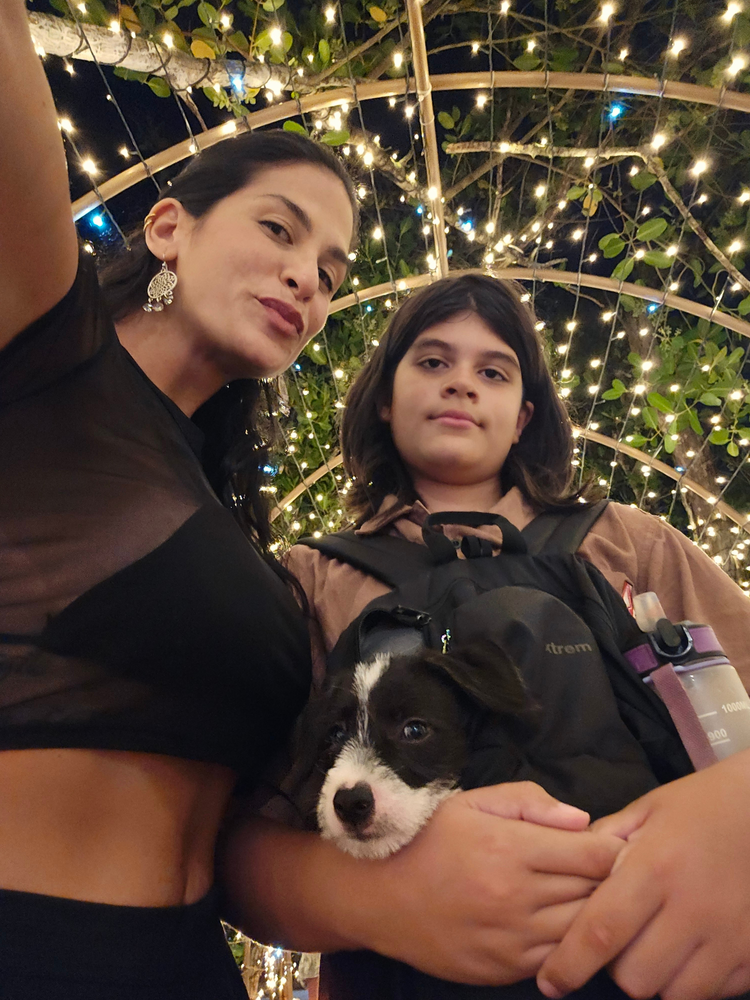 The image shows a woman and a child in front of a structure adorned with lights, possibly a pergola or trellis. The woman, who appears to be taking a selfie, is wearing a black top and has dangling ea…read more
