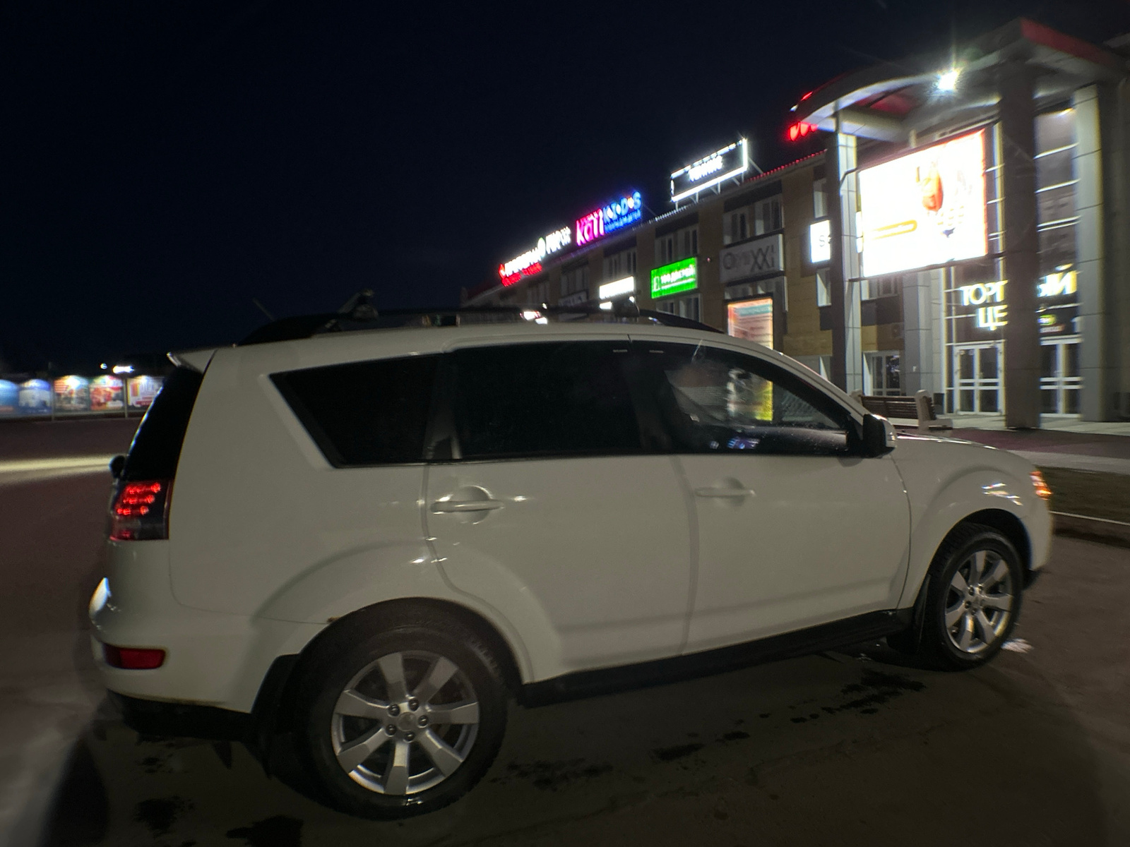 The image shows a white SUV parked at night outside of the торговый центр «Универсам» in Chaikovsky, Russia. Multiple business signs are visible on the building. The scene is dark with artificial ligh…read more