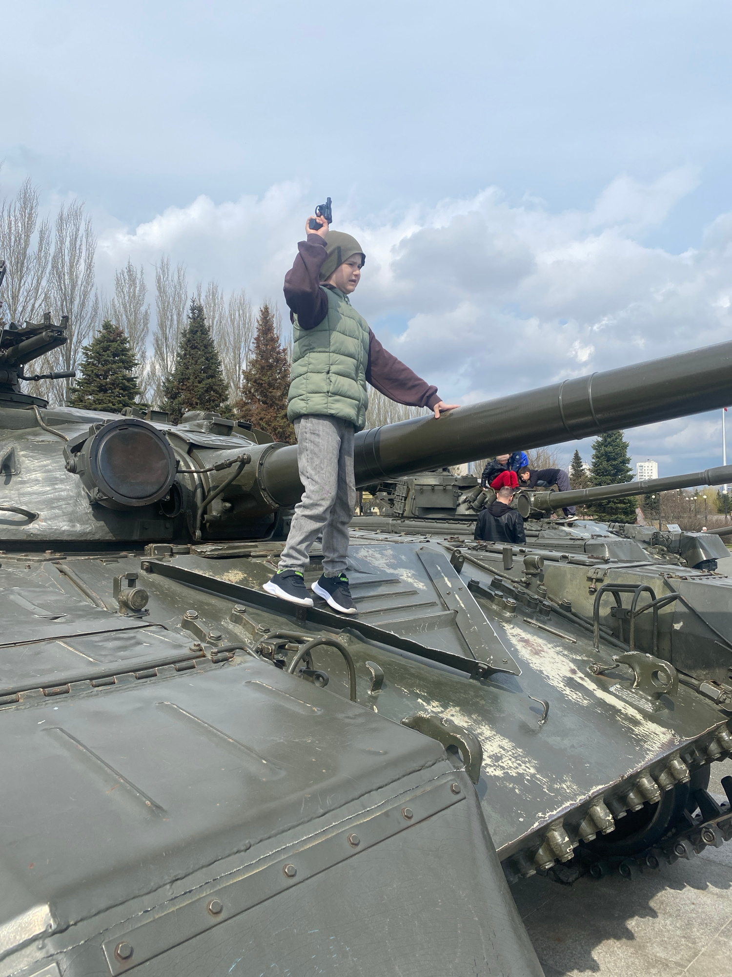 This image depicts an outdoor scene at a military exhibition or museum, likely in Kazan, Russia, on a cloudy but bright day. The central subject is a young person, possibly a boy or teenager, standing…read more
