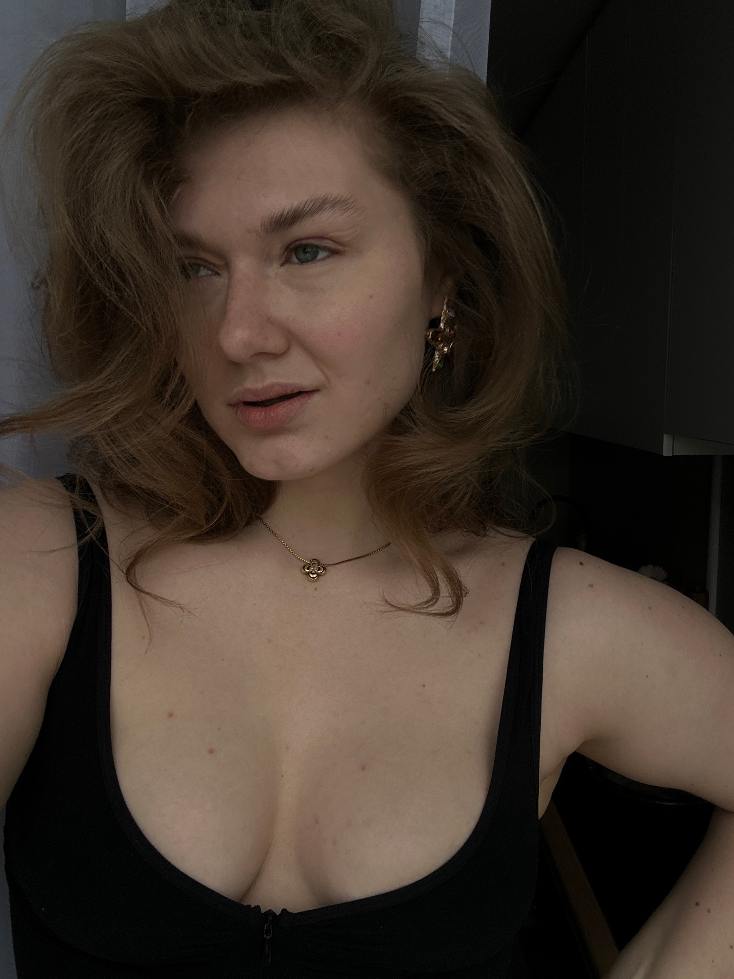 A woman with light brown hair, wearing a black tank top and a gold necklace with a four-leaf clover pendant, lies on a surface with a light background. Her head is tilted to the left, and she is looki…read more