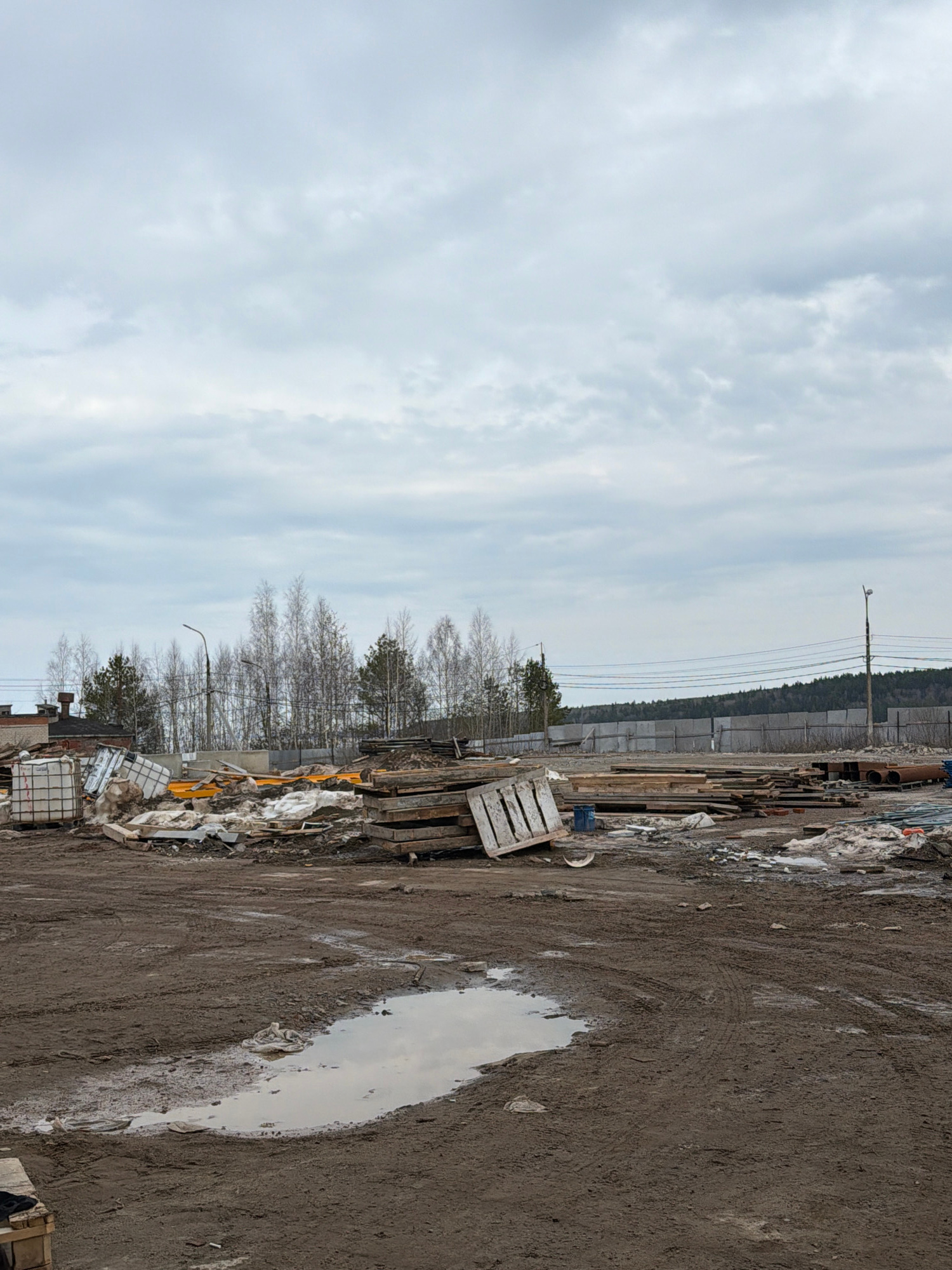 The image depicts a muddy, industrial-looking area in Chaikovsky, Russia. To the left of the dirt road is a collection of discarded items, including wood pallets, plastic containers, and construction…read more