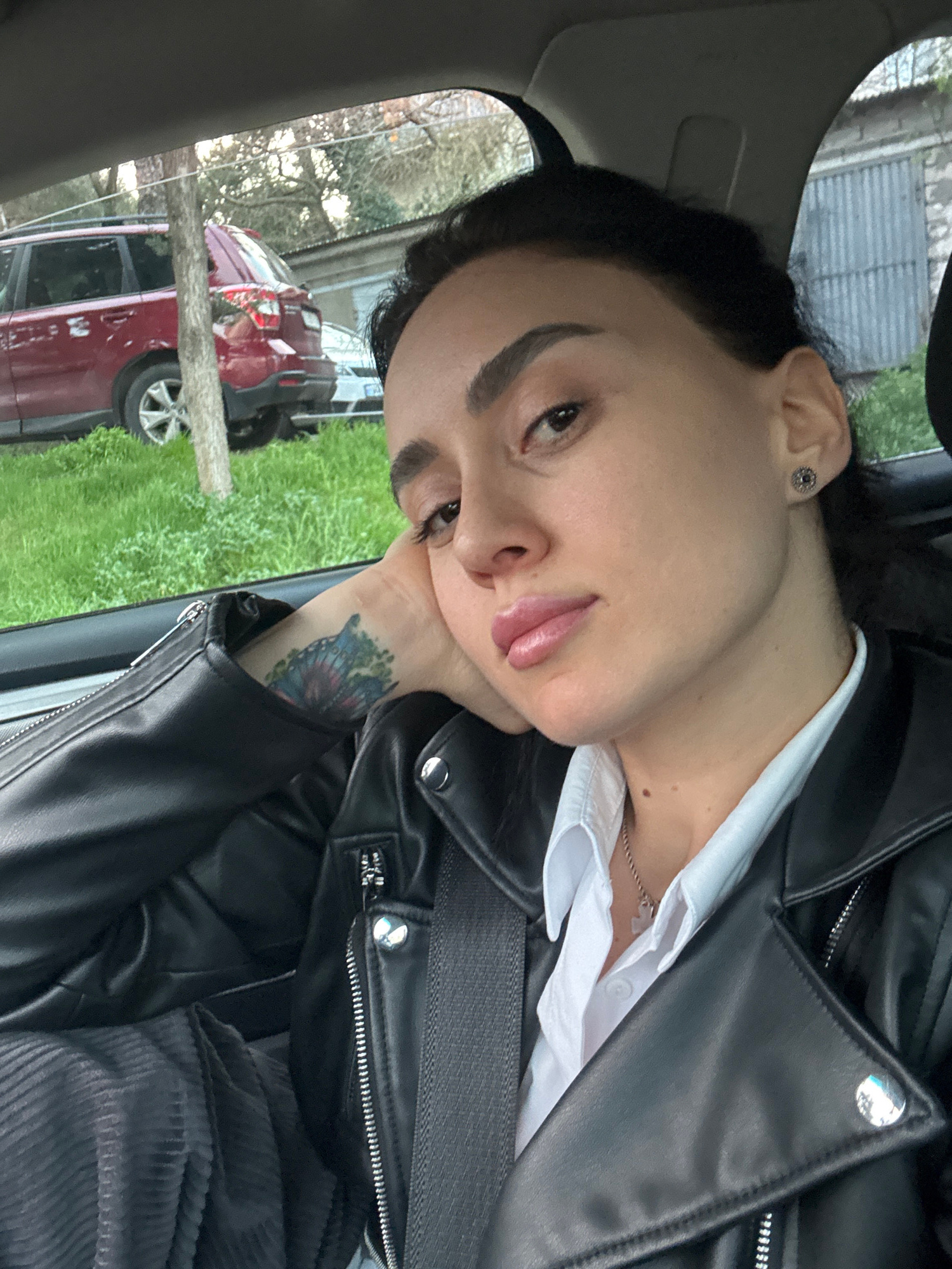 A person is posing for a selfie inside a car. The person has fair skin, dark hair, and is wearing a black leather jacket over a white collared shirt, with a seatbelt across their chest. Their head is…read more