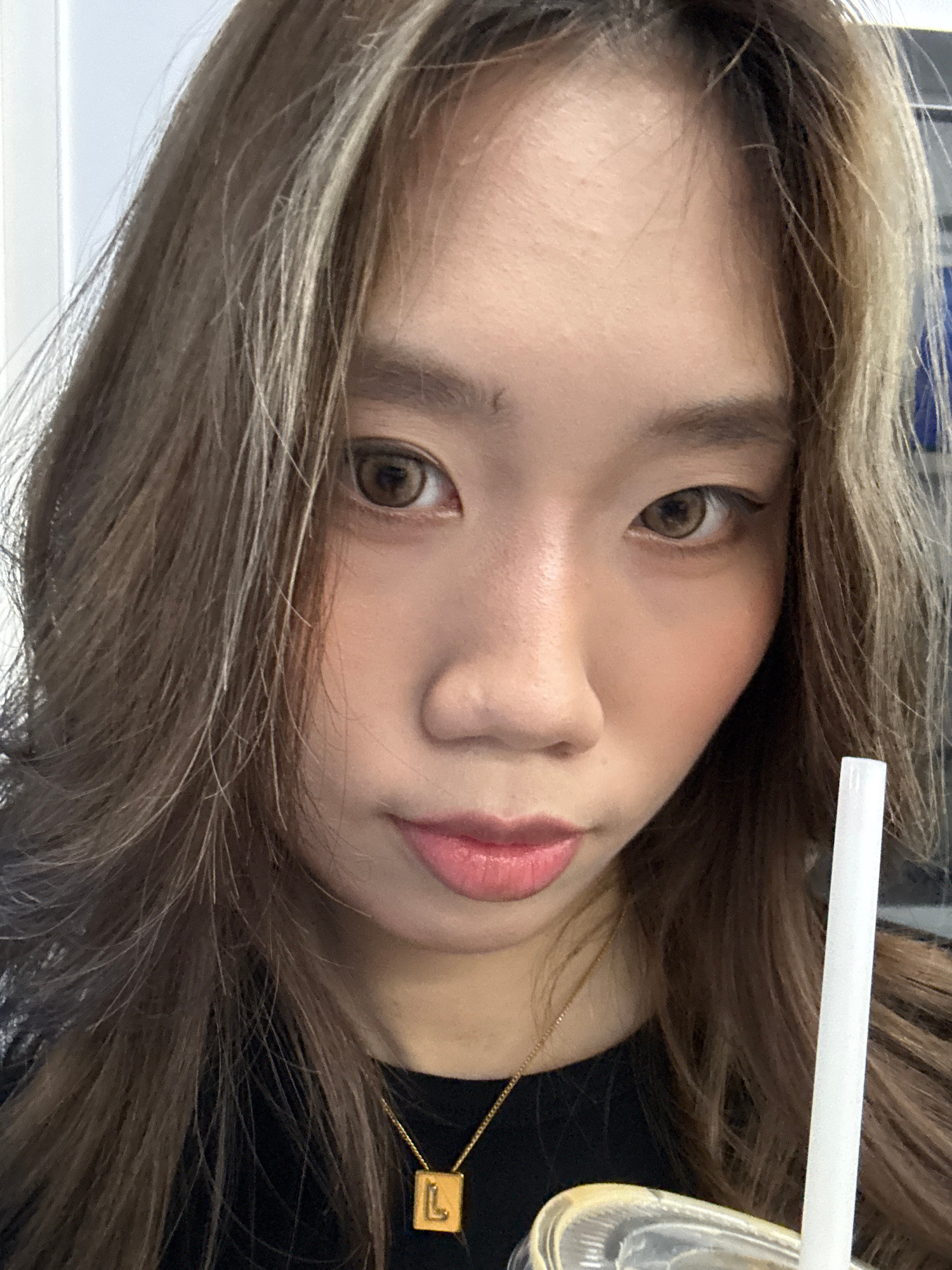 A close-up, tilted selfie of a young woman with light brown hair and eyes. She is wearing a black shirt and a gold necklace. A white straw is visible in the upper right corner. The location cannot be…read more