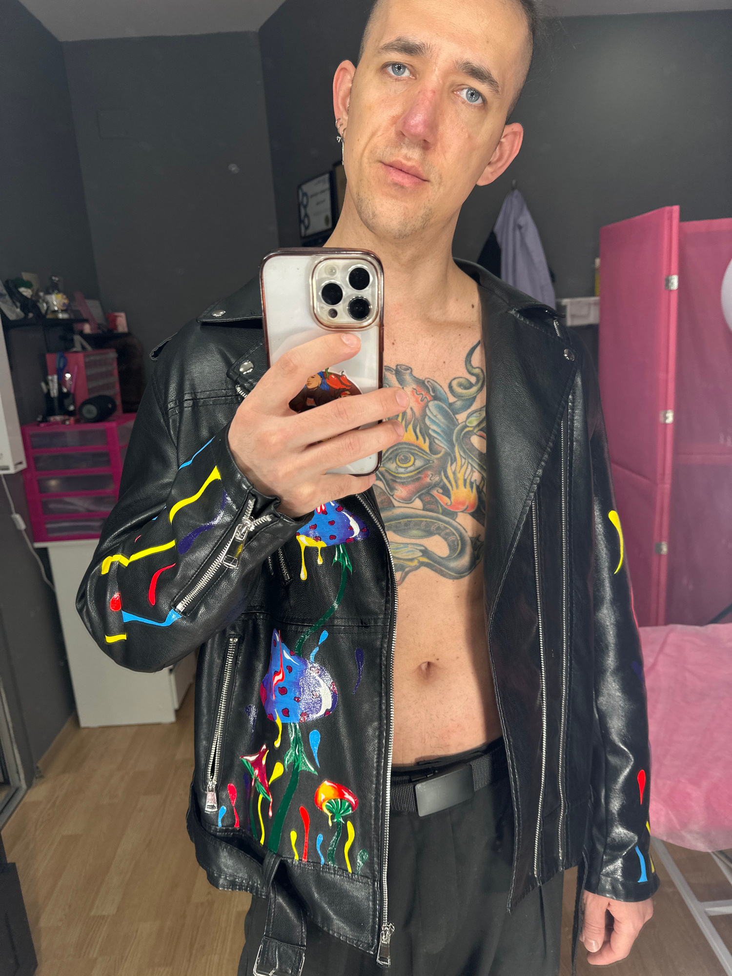 A fair-skinned person with short hair and light eyes is holding an iPhone and taking a selfie in what appears to be a room or dressing area with a grey wall and a wooden floor. The person is wearing a…read more
