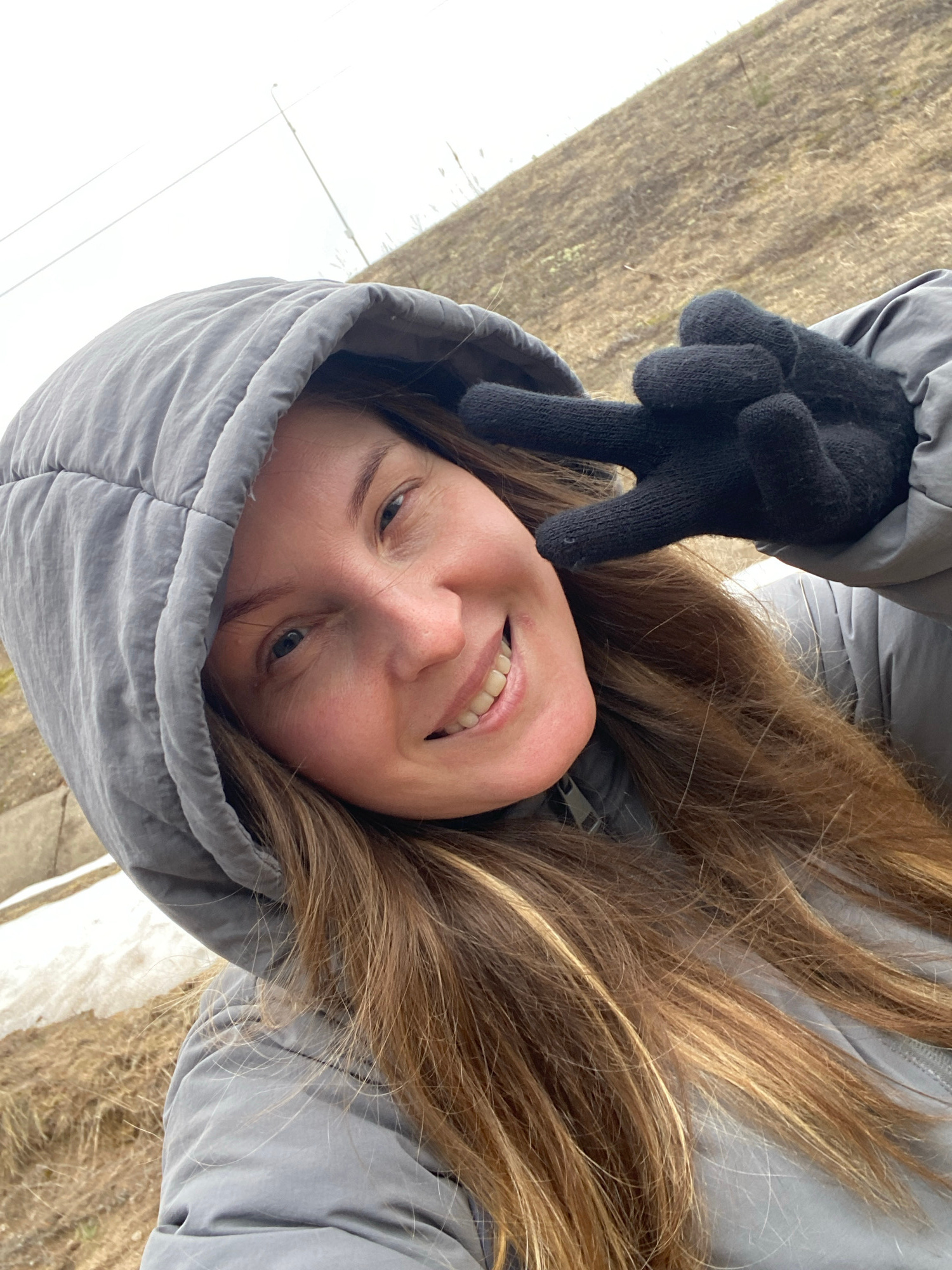 A woman with long, light brown hair and blue eyes is wearing a gray hooded jacket and black gloves. She is smiling and making a peace sign with her gloved hand. The background appears to be an outdoor…read more