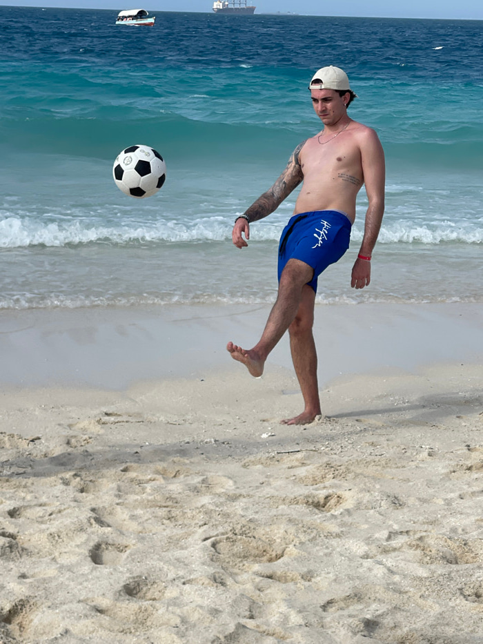 This image depicts a young adult male performing a beach soccer maneuver on a sandy shoreline, identified as being within the city of Zanzibar, Tanzania. The male, standing barefoot on the light-color…read more