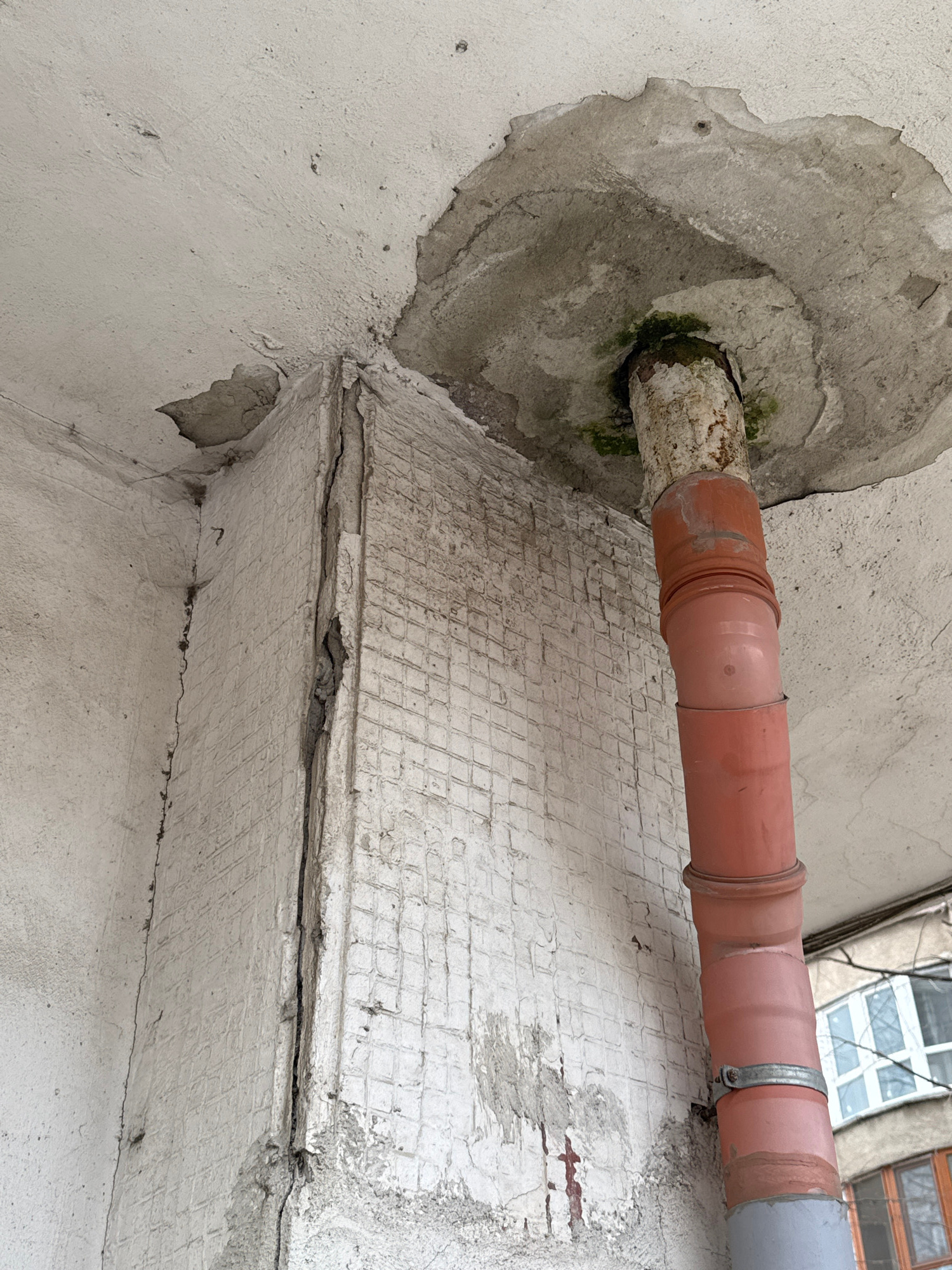The image shows a section of an exterior wall, possibly of a building in Burgas, Bulgaria. A pipe, partially orange and gray, extends horizontally through a rough, circular opening in the wall. The op…read more