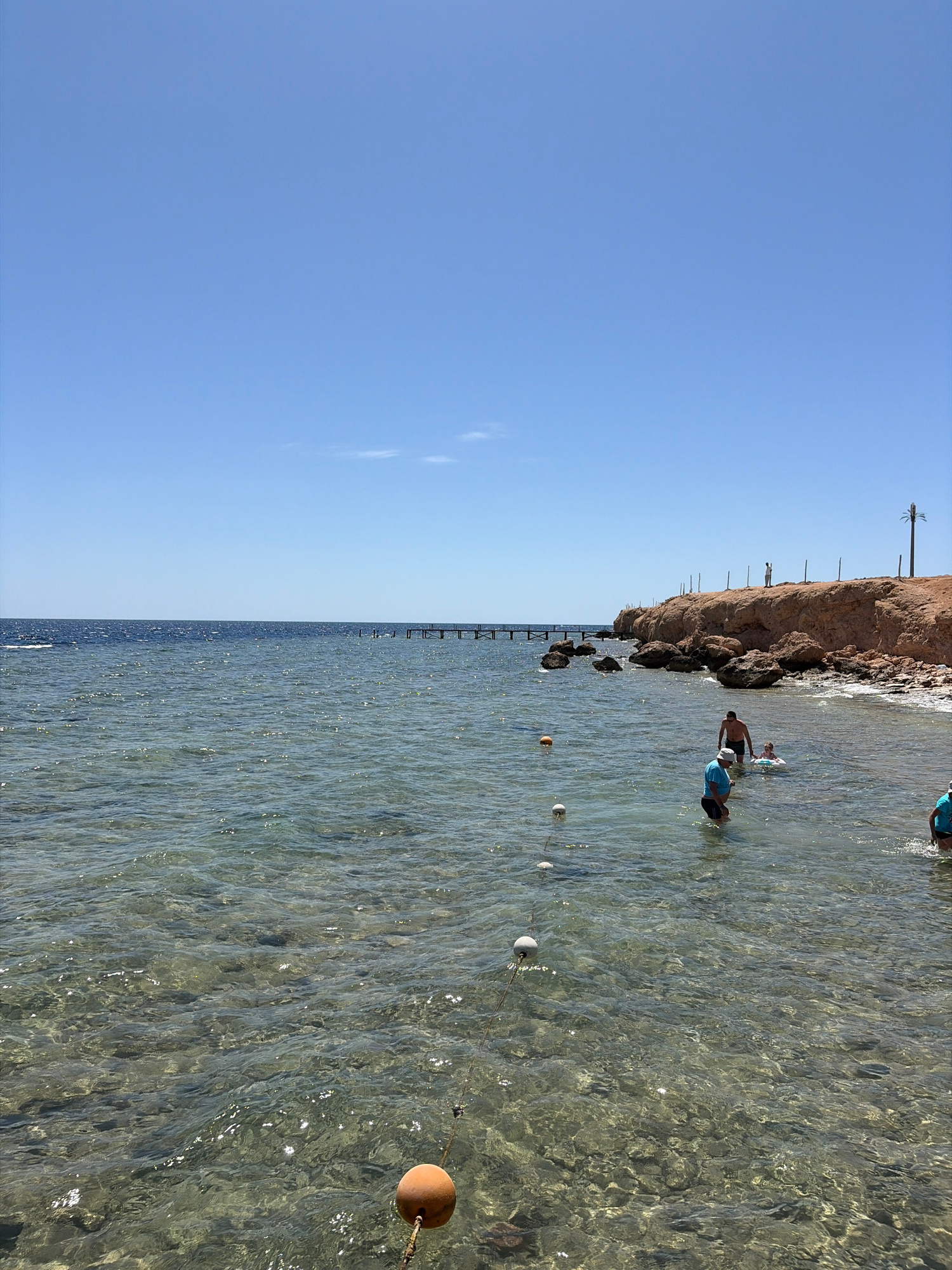 This image depicts a coastal scene in Sharm El Sheikh, Egypt, under a clear blue sky. The foreground shows shallow, transparent seawater revealing a rocky seabed, with sunlight reflecting on the surfa…read more