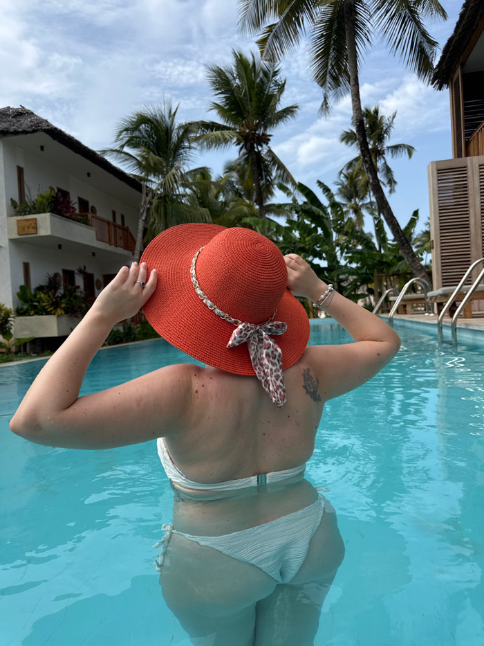 The image displays a person from behind, partially submerged in a clear blue swimming pool under a bright, partly cloudy sky. The individual, a female, wears a white textured two-piece bikini and a la…read more
