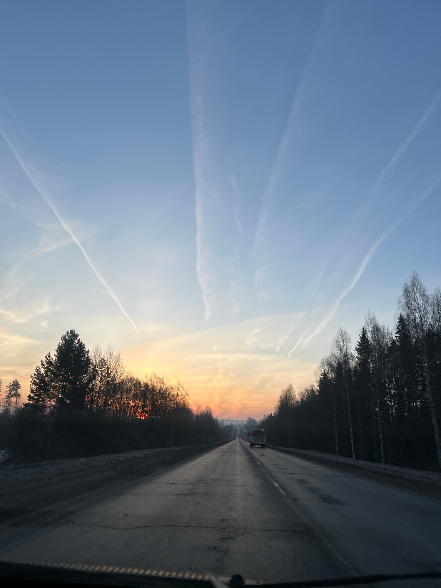 The image shows a view down a straight road flanked by trees on both sides. The sky is blue with contrails and a gradient of orange and yellow near the horizon, indicating sunrise or sunset. A vehicle…read more