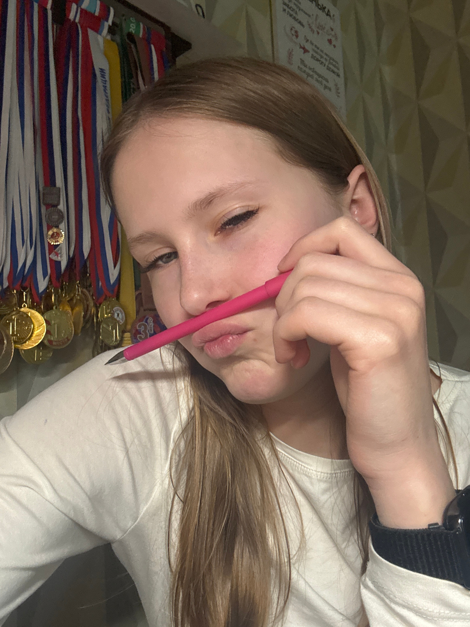 An indoor, tilted photograph depicts a young female, likely a teenager, with light brown hair, wearing a white long-sleeved shirt and a black smartwatch on her left wrist. She holds a pink pen between…read more
