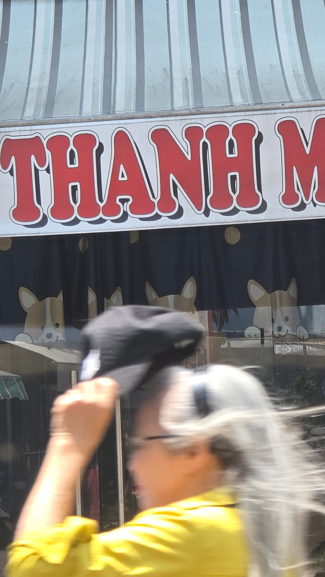 The scene shows a blurry image of a person wearing a yellow shirt and a cap, with a sign that reads "THANH NAM" in large red letters. The background includes a blue and white striped awning and a curt…read more