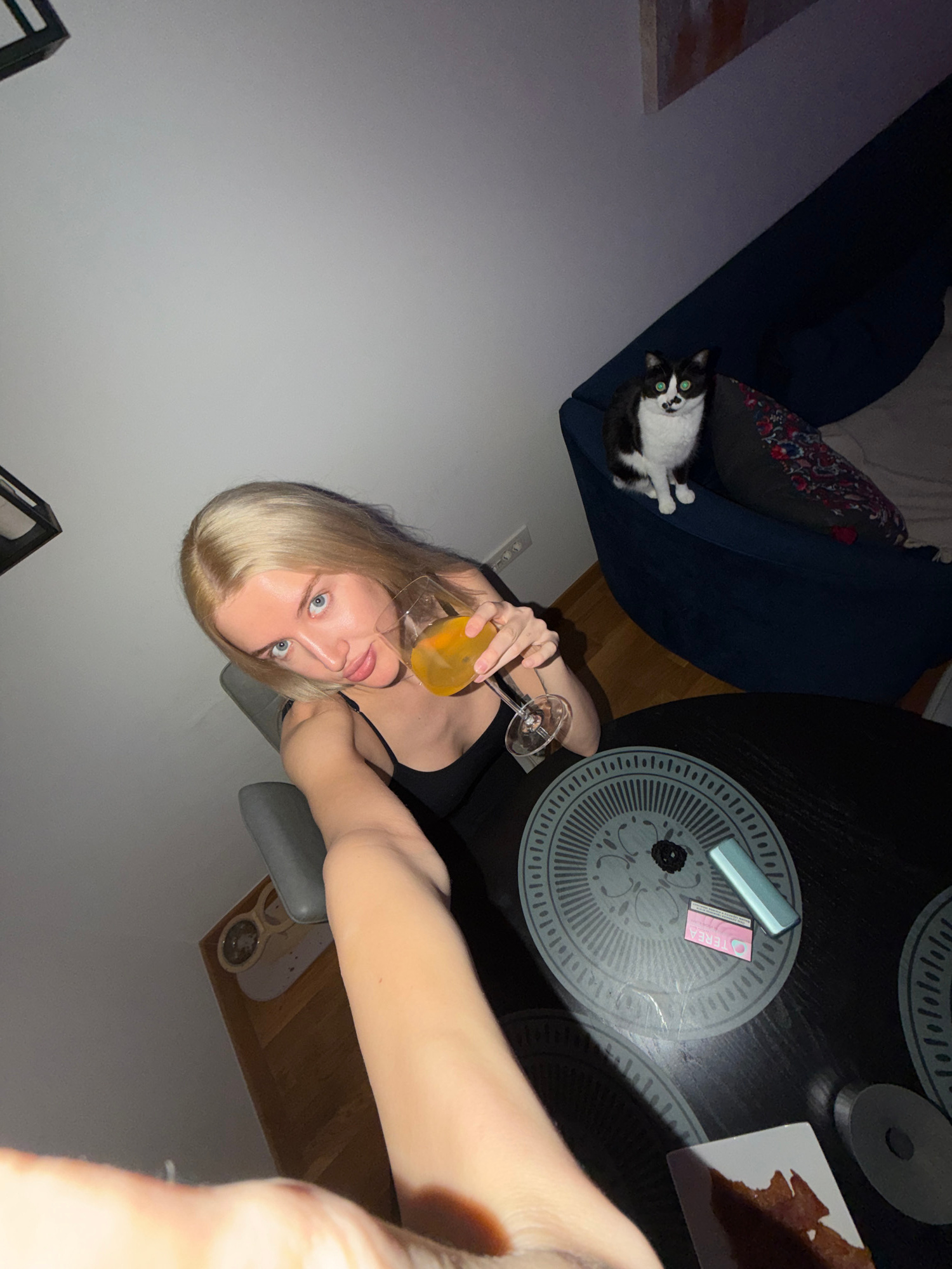 The image shows a woman with blonde hair and blue eyes taking a selfie while holding a glass of orange liquid, likely a cocktail, indoors. A tuxedo cat rests on a dark blue couch with a patterned pill…read more
