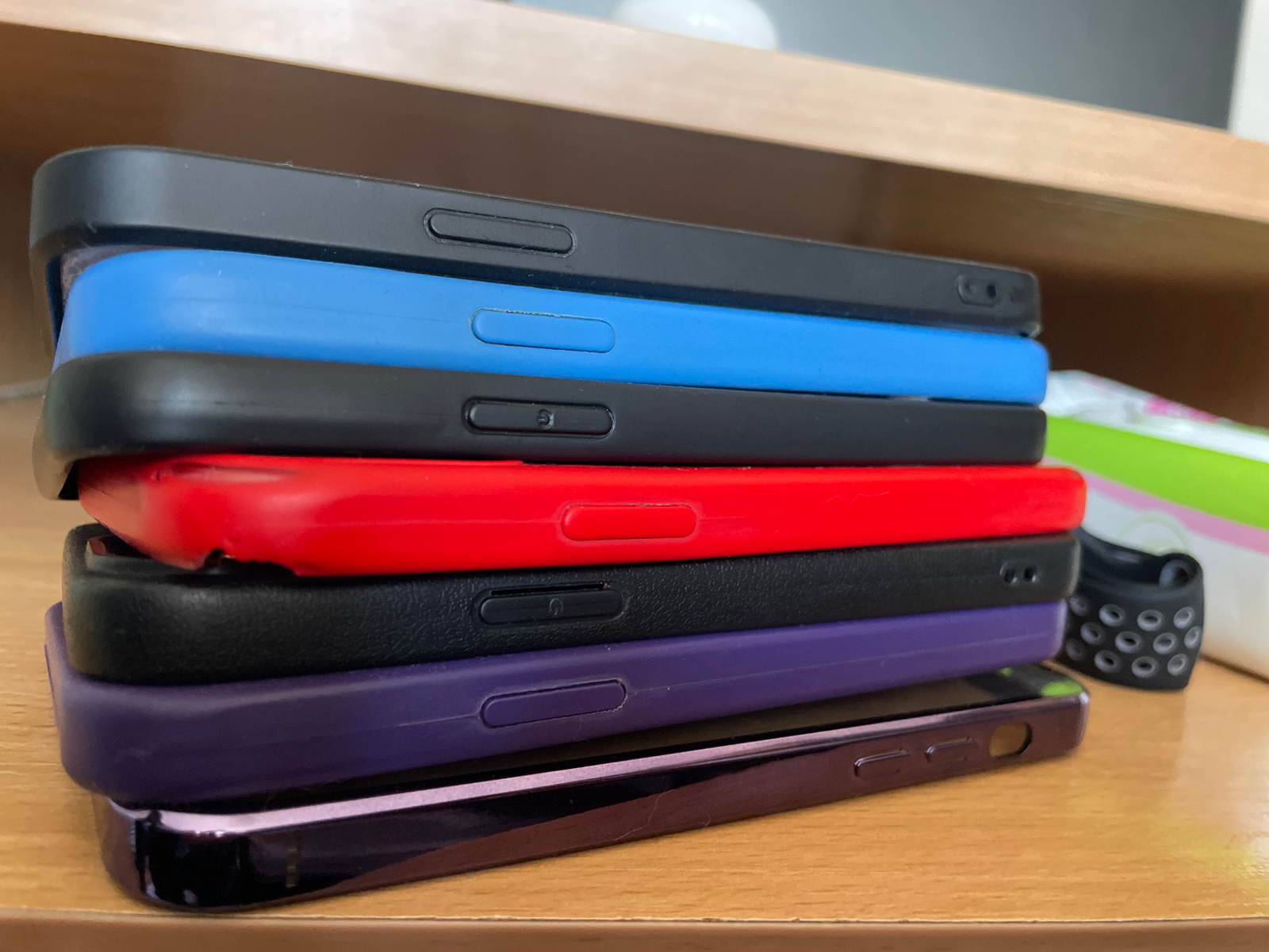 A stack of seven cell phone cases is on a table. From top to bottom, the cases are black, blue, black, red, black, purple, and dark purple. A black object with holes is next to the cases on the right.…read more