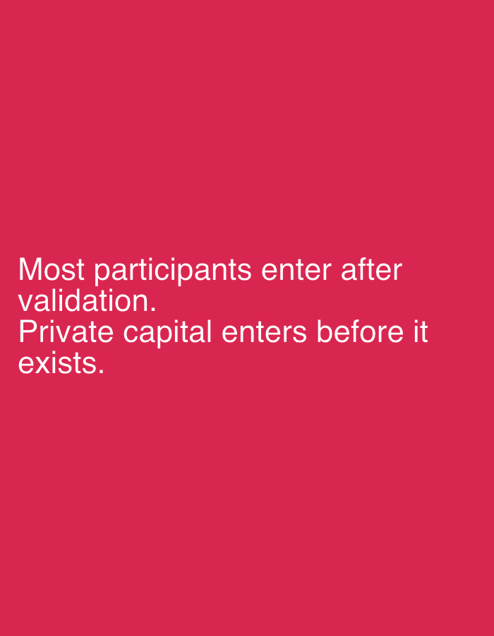 The image is a solid pink background with white text at the bottom. The text reads: "Most participants enter after validation. Private capital enters before it exists." There is no location in Lokoja,…read more