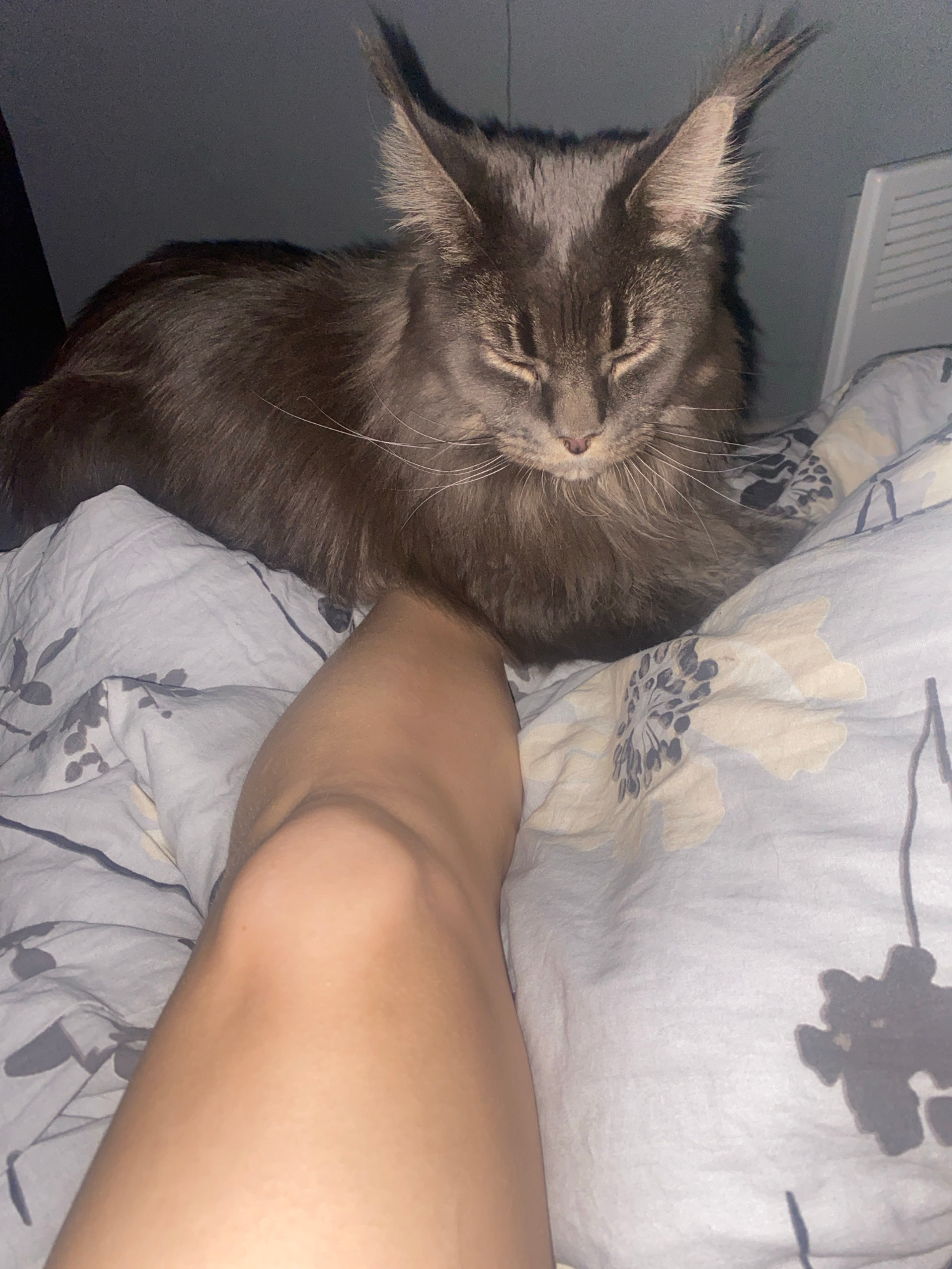 A gray Maine Coon cat is lying on a bed next to a person's arm. The cat's eyes are closed. The bed is covered with a patterned comforter. The environment appears to be indoors. No indication of Chaiko…read more