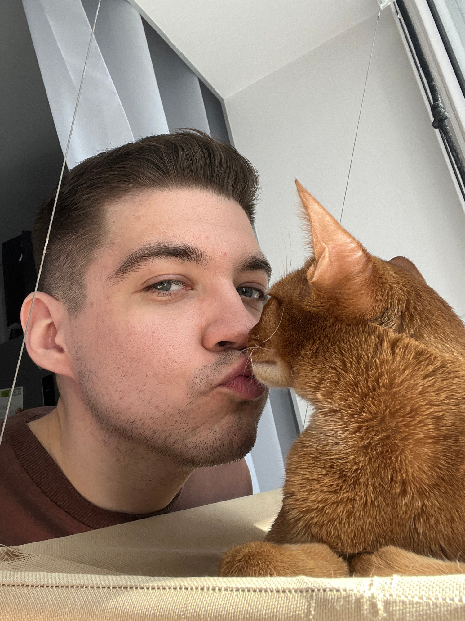 An indoor, close-up photograph depicts an adult male and an orange Abyssinian-type cat engaging in an interaction. The male, positioned on the left, has short brown hair, light skin, and a visible gre…read more