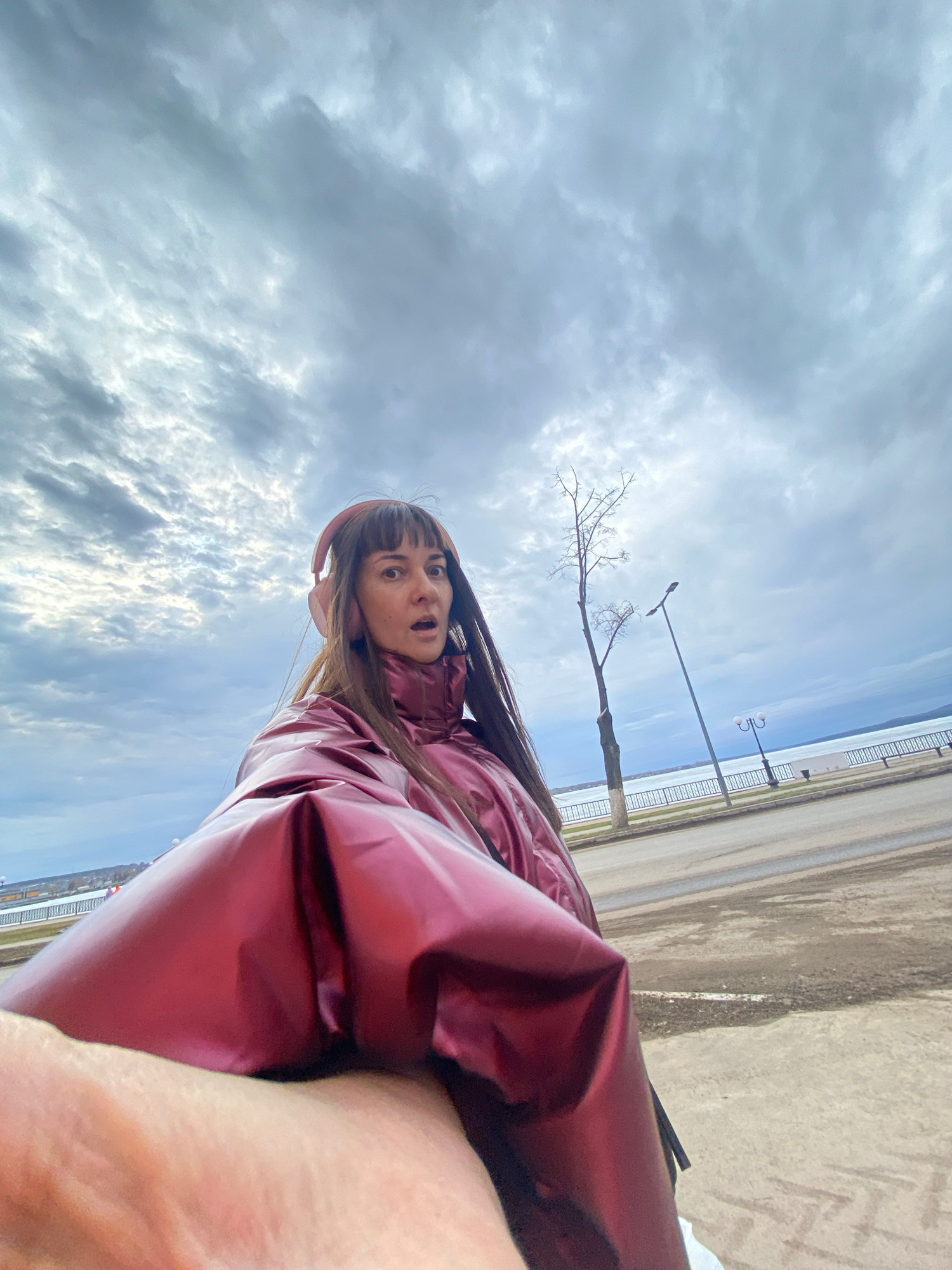 A low-angle, selfie-style shot depicts a woman wearing a shiny, reddish-purple jacket and light pink headphones. She has light skin, brown hair with bangs, and an open-mouthed expression, suggesting s…read more