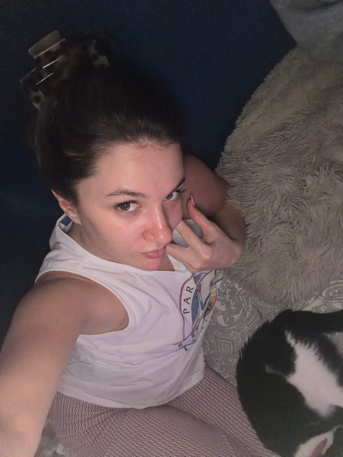 A person lies on a bed in a casual pose. They wear a white sleeveless top and patterned pink pants. A fluffy gray pillow is near their head, and a black and white cat sleeps curled up nearby. The pers…read more