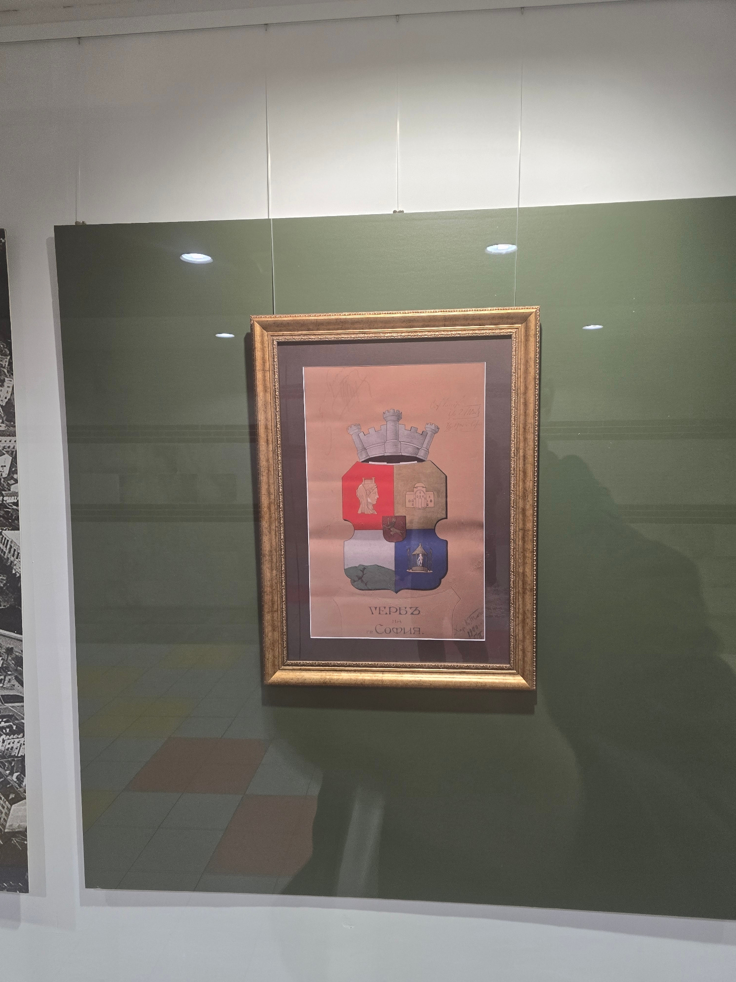 A framed drawing of the coat of arms of Sofia, Bulgaria hangs on a green wall. The drawing is in a gold-colored frame. The drawing itself is of a shield divided into quarters, with a fortress tower on…read more