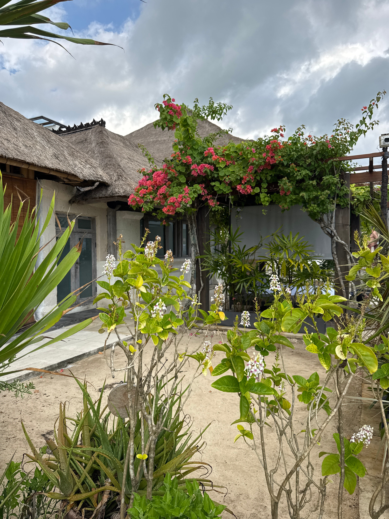 This image depicts a building with a thatched roof located in Kuta Selatan, Indonesia. The building is two stories tall. The exterior wall is painted a light color. Vines with red flowers are growing…read more