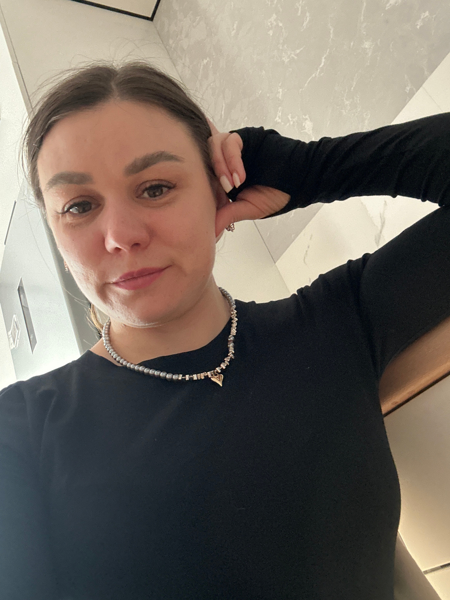A woman is taking a selfie. She is wearing a black long-sleeved shirt with thumb holes and a beaded necklace with a small triangular charm. She is holding her hair near her ear. The background appears…read more