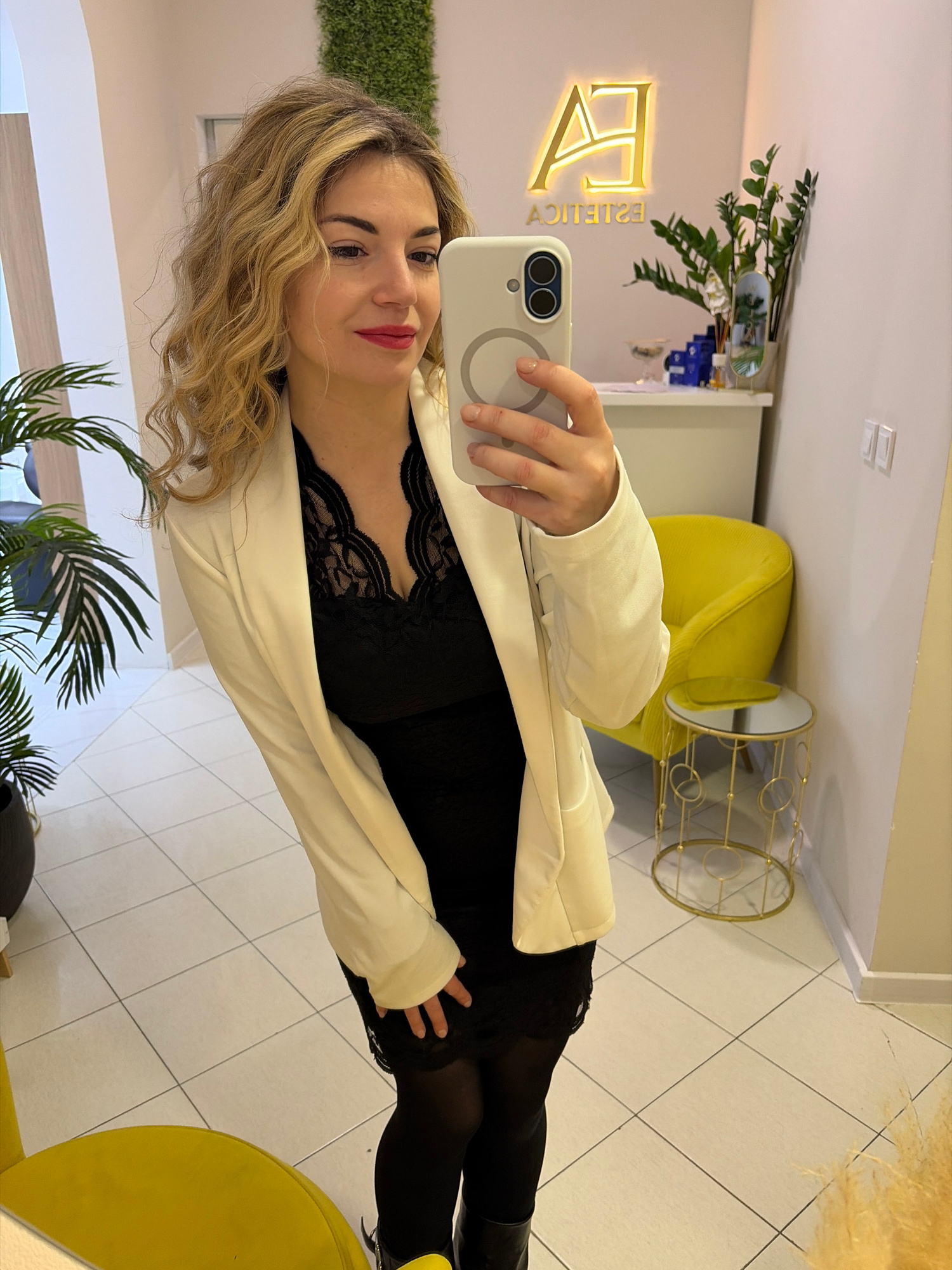 A woman with light blonde hair takes a selfie. She's wearing a black lace dress and a white blazer. She is standing in a room with white tiled floors, next to a yellow chair and a small gold end table…read more