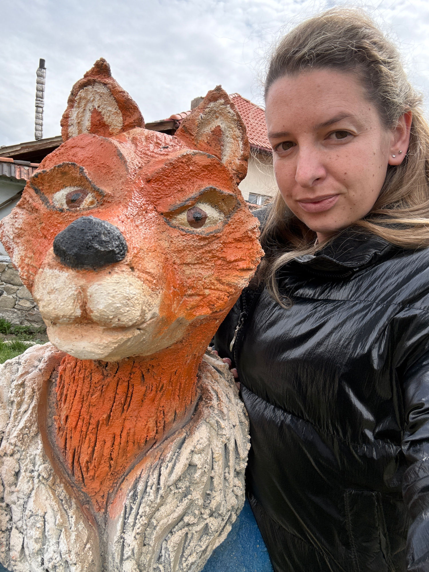 A woman is posing for a selfie with a large sculpture of a fox. The woman is fair-skinned with blonde hair and is wearing a black puffy jacket. The fox sculpture is made of concrete and painted with o…read more