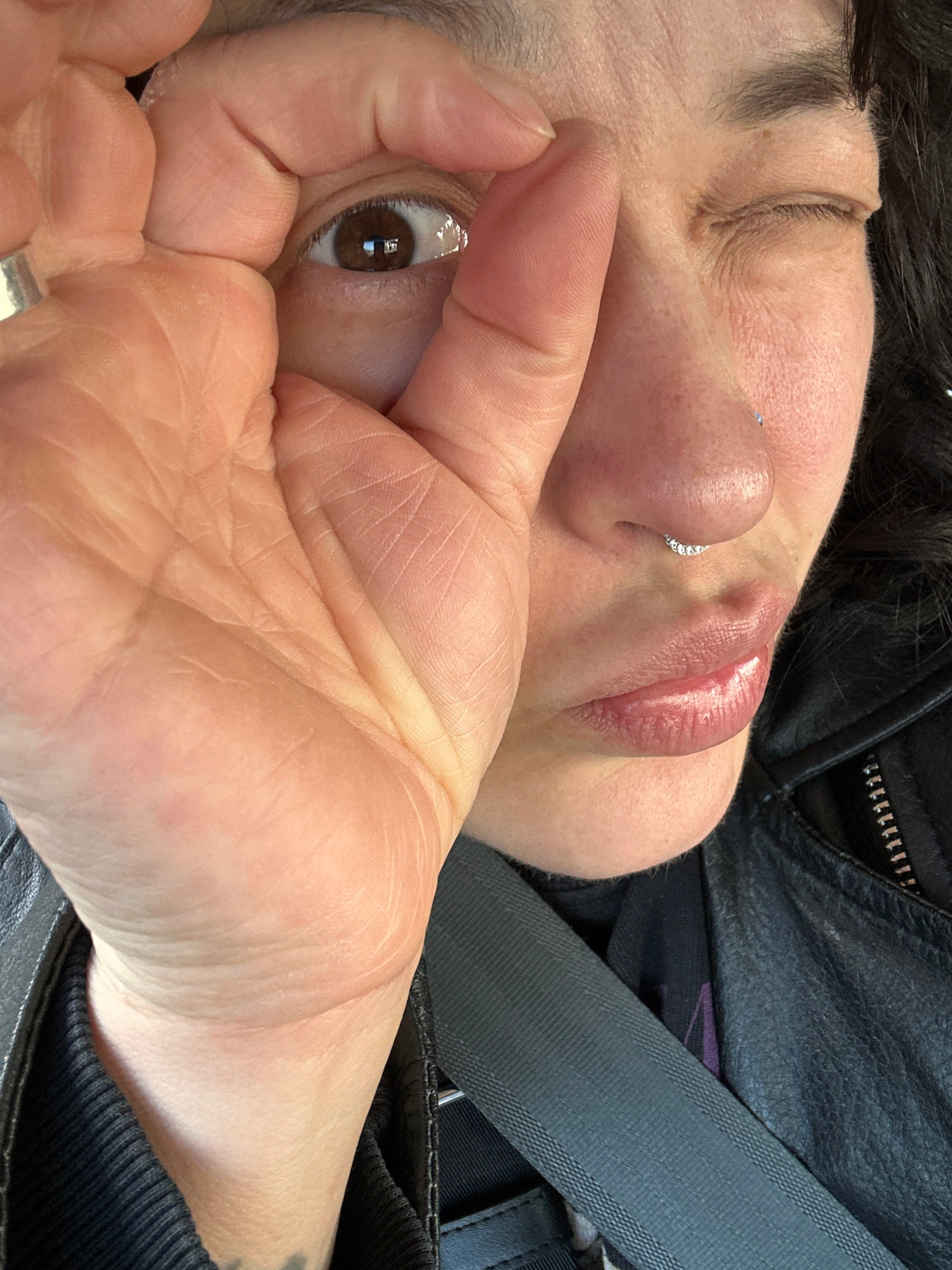A close-up, off-kilter shot focuses on a person's face obscured partially by their own hand. The person has fair skin, dark hair, and a nose ring. Their right eye is open, showing a brown iris. A ringβ¦read more