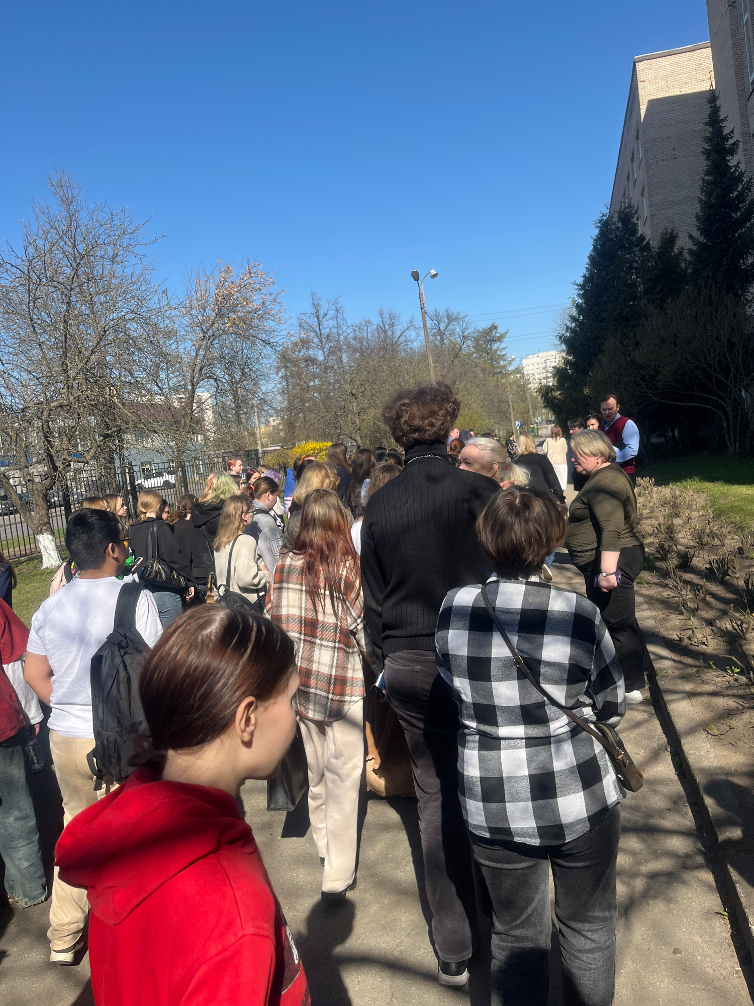 The image displays an outdoor scene under a clear, bright blue sky, indicative of a sunny day, likely mid-morning or afternoon given the strong sunlight and shadows. A diverse group of people, appeari…read more