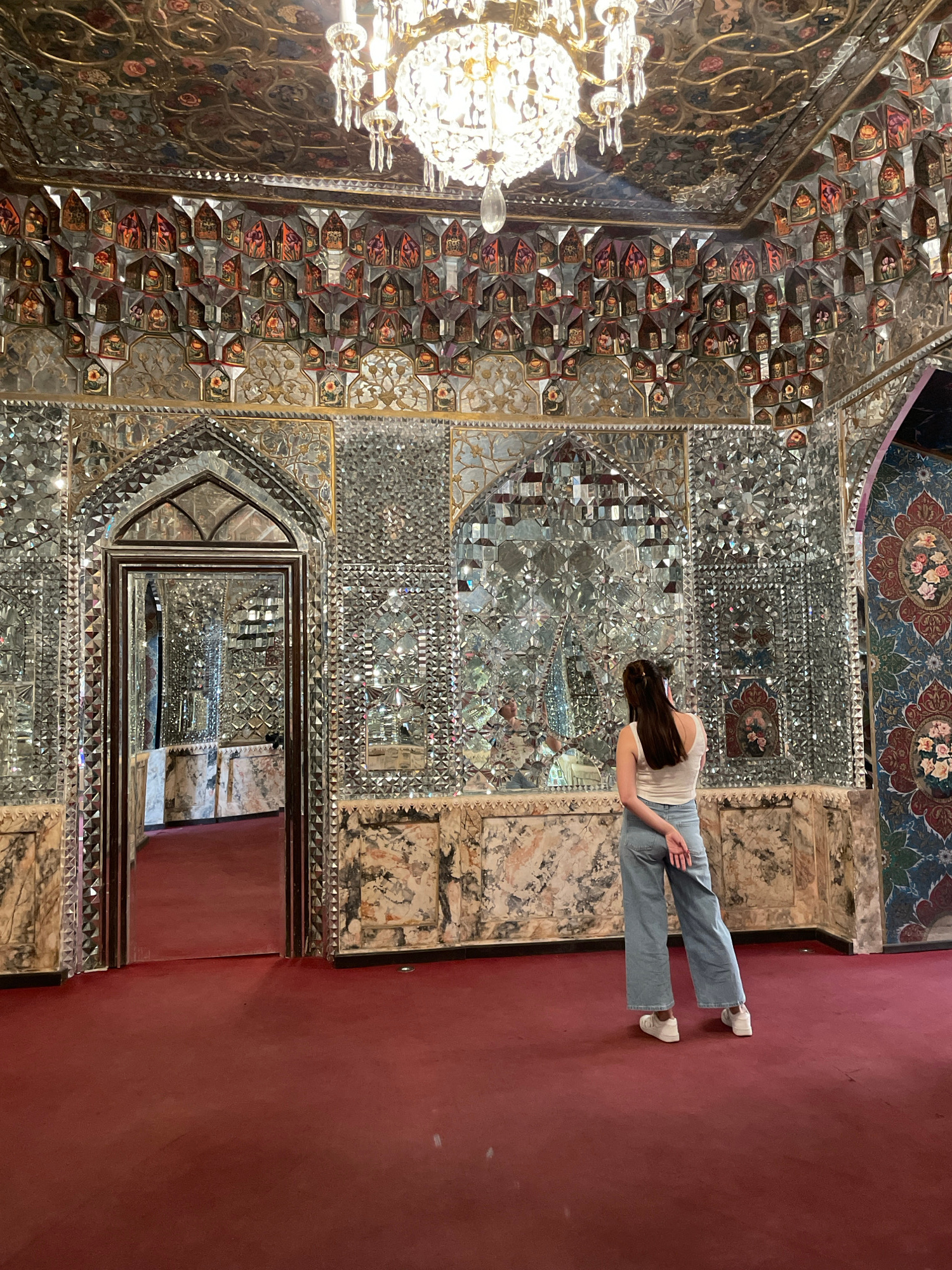The image displays the interior of a lavishly decorated room, characterized by extensive and intricate mirror mosaic work (Shishehkari) covering the walls and ceiling. A person is central to the frame…read more